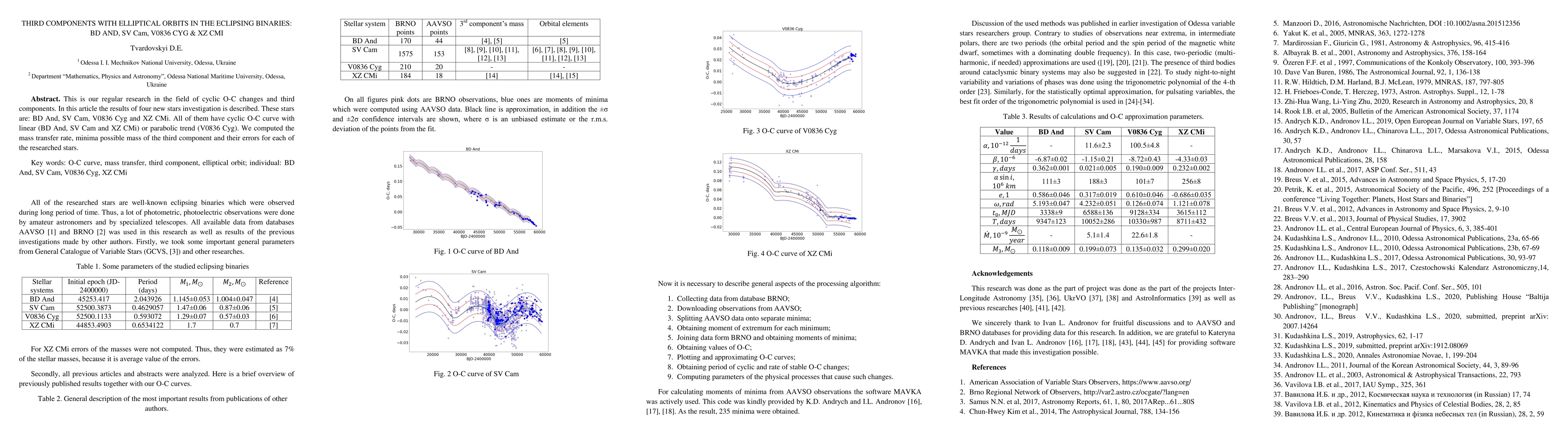 This is our regular research in the field of cyclic O-C changes and third components. In this article the results of four new stars investigation is described. These stars are: BD And, SV Cam, V0836 Cyg and XZ CMi. All of them have cyclic O-C curve with linear (BD And, SV Cam and XZ CMi) or parabolic trend (V0836 Cyg). We computed the mass transfer rate, minima possible mass of the third component and their errors for each of the researched stars.