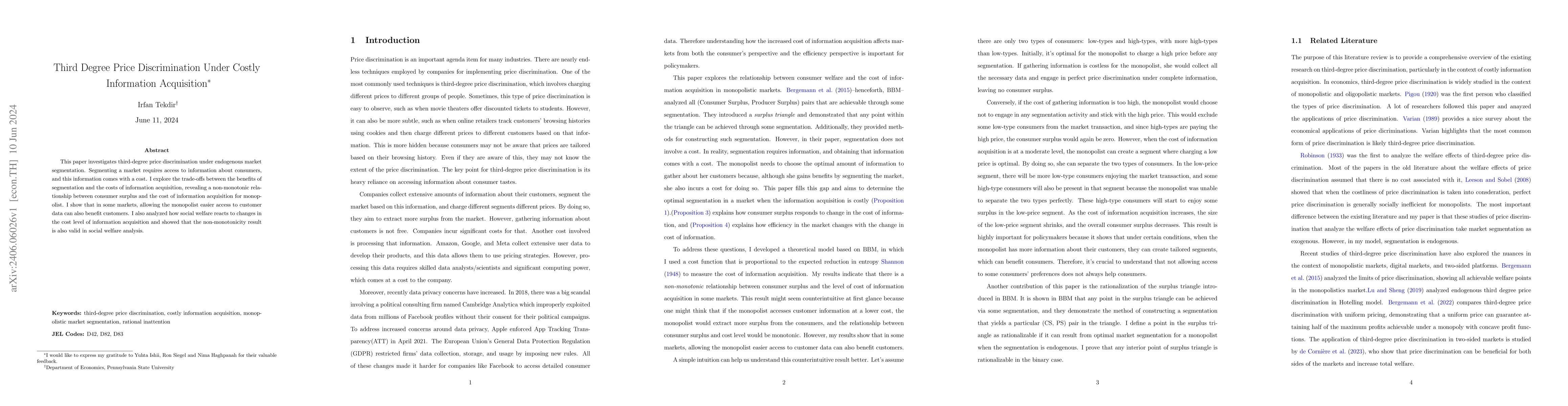 This paper examines third-degree price discrimination under market segmentation, highlighting a non-monotonic relationship between consumer surplus and the cost of acquiring information. It reveals that easier access to customer data can sometimes benefit consumers, and similarly, social welfare also shows non-monotonicity in response to information cost changes.