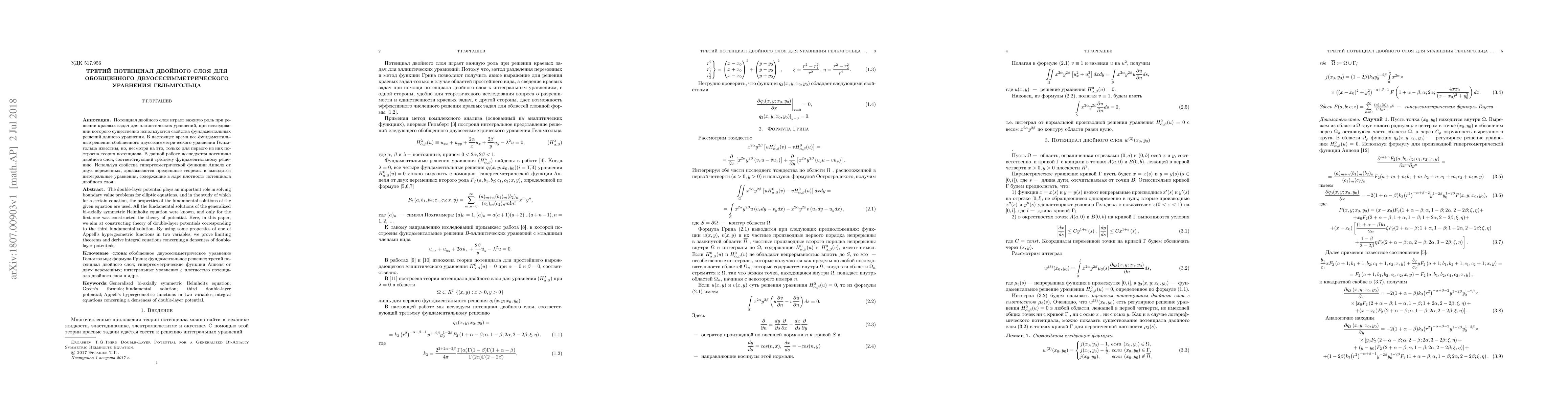 The double-layer potential plays an important role in solving boundary value problems for elliptic equations, and in the study of which for a certain equation, the properties of the fundamental solutions of the given equation are used. All the fundamental solutions of the generalized bi-axially symmetric Helmholtz equation were known, and only for the first one was constructed the theory of potential. Here, in this paper, we aim at constructing theory of double-layer potentials corresponding to the third fundamental solution. By using some properties of one of Appell's hypergeometric functions in two variables, we prove limiting theorems and derive integral equations concerning a denseness of double-layer potentials.