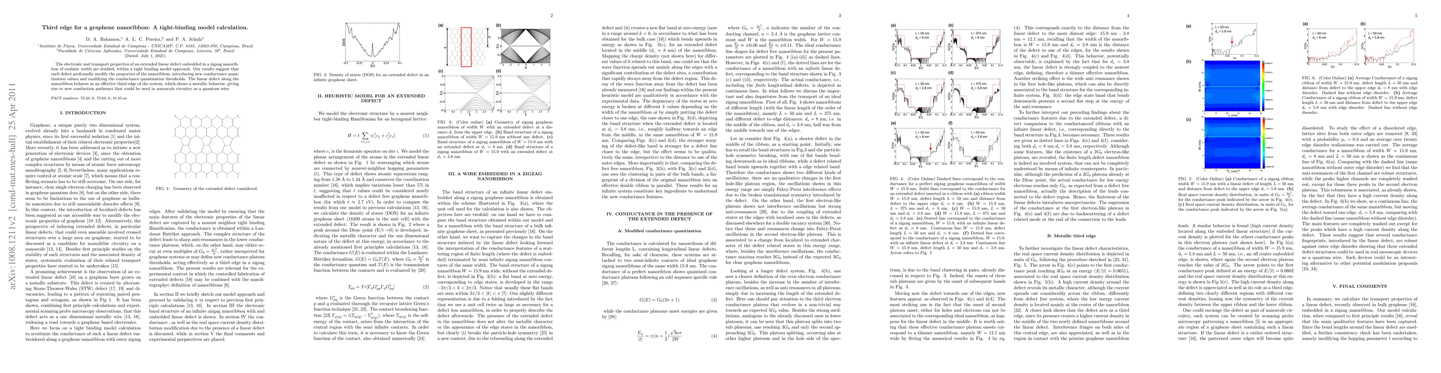 The electronic and transport properties of an extended linear defect embedded in a zigzag nanoribbon of realistic width are studied, within a tight binding model approach. Our results suggest that such defect profoundly modify the properties of the nanoribbon, introducing new conductance quantization values and modifying the conductance quantization thresholds. The linear defect along the nanoribbon behaves as an effective third edge of the system, which shows a metallic behavior, giving rise to new conduction pathways that could be used in nanoscale circuitry as a quantum wire.