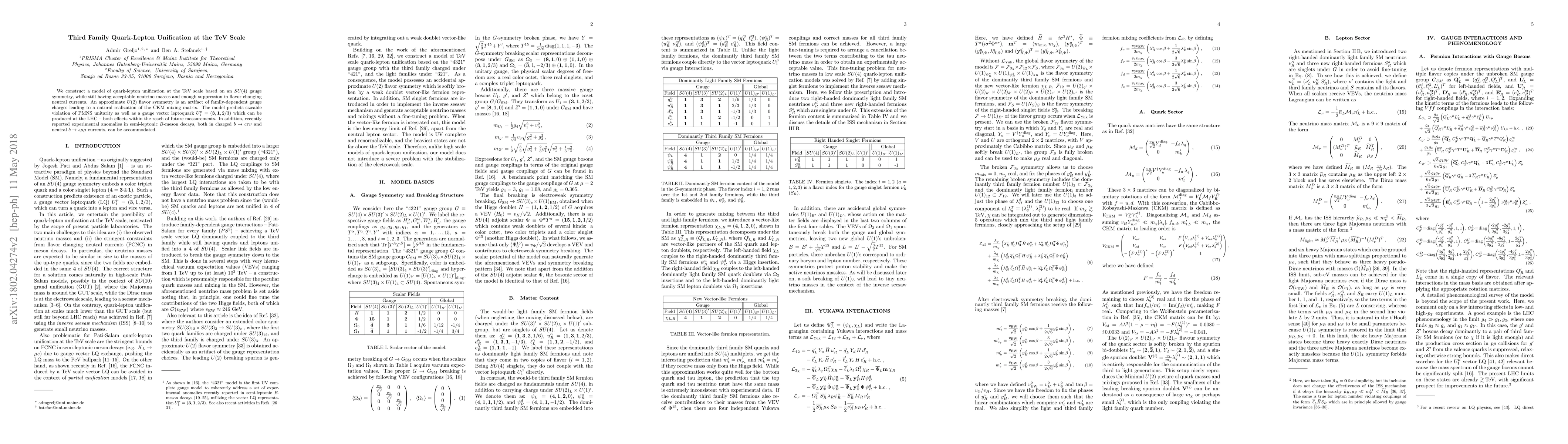 We construct a model of quark-lepton unification at the TeV scale based on an $SU(4)$ gauge symmetry, while still having acceptable neutrino masses and enough suppression in flavor changing neutral currents. An approximate $U(2)$ flavor symmetry is an artifact of family-dependent gauge charges leading to a natural realization of the CKM mixing matrix. The model predicts sizeable violation of PMNS unitarity as well as a gauge vector leptoquark $U_1^\mu = ({\bf 3}, {\bf 1}, 2/3)$ which can be produced at the LHC -- both effects within the reach of future measurements. In addition, recently reported experimental anomalies in semi-leptonic $B$-meson decays, both in charged $b \to c \tau \nu$ and neutral $b \to s \mu \mu$ currents, can be accommodated.
