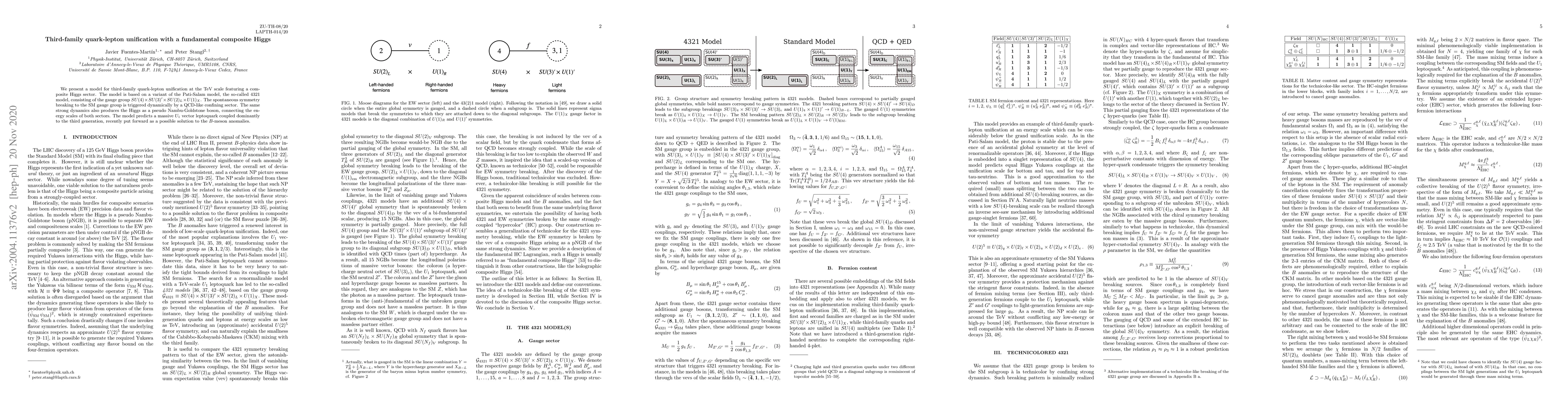 We present a model for third-family quark-lepton unification at the TeV scale featuring a composite Higgs sector. The model is based on a variant of the Pati-Salam model, the so-called 4321 model, consisting of the gauge group $SU(4)\times SU(3)^\prime\times SU(2)_L\times U(1)_X$. The spontaneous symmetry breaking to the SM gauge group is triggered dynamically by a QCD-like confining sector. The same strong dynamics also produces the Higgs as a pseudo Nambu-Goldstone boson, connecting the energy scales of both sectors. The model predicts a massive $U_1$ vector leptoquark coupled dominantly to the third generation, recently put forward as a possible solution to the $B$-meson anomalies.