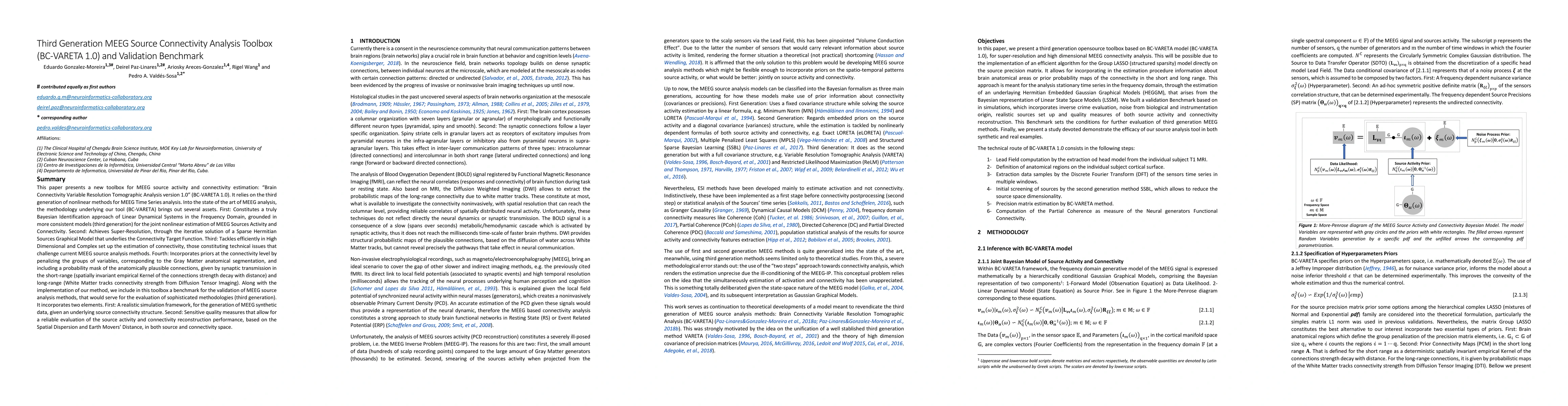 This paper presents a new toolbox for MEEG source activity and connectivity estimation: Brain Connectivity Variable Resolution Tomographic Analysis version 1.0 (BC-VARETA 1.0). It relies on the third generation of nonlinear methods for the analysis of resting state MEEG Time Series. Into the state of the art of MEEG analysis, the methodology underlying our tool (BC-VARETA) brings out several assets. First: Constitutes a Bayesian Identification approach of Linear Dynamical Systems in the Frequency Domain, grounded in more consistent models (third generation). Second: Achieves Super-Resolution, through the iterative solution of a Sparse Hermitian Source Graphical Model. Third: Tackles efficiently in High Dimensional and Complex set up the estimation of connectivity. Fourth: Incorporates priors at the connectivity level by penalizing the groups of variables, corresponding to the Gray Matter anatomical segmentation, and including a probability mask of the anatomically plausible connections. Along with the implementation of our method, we include in this toolbox a benchmark for the validation of MEEG source analysis methods, that would serve for the evaluation of sophisticated methodologies (third generation). It incorporates two elements. First: A realistic simulation framework, for the generation of MEEG synthetic data, given an underlying source connectivity structure. Second: Sensitive quality measures that allow for a reliable evaluation of the source activity and connectivity reconstruction performance, based on the Spatial Dispersion and Earth Movers Distance, in both source and connectivity space.