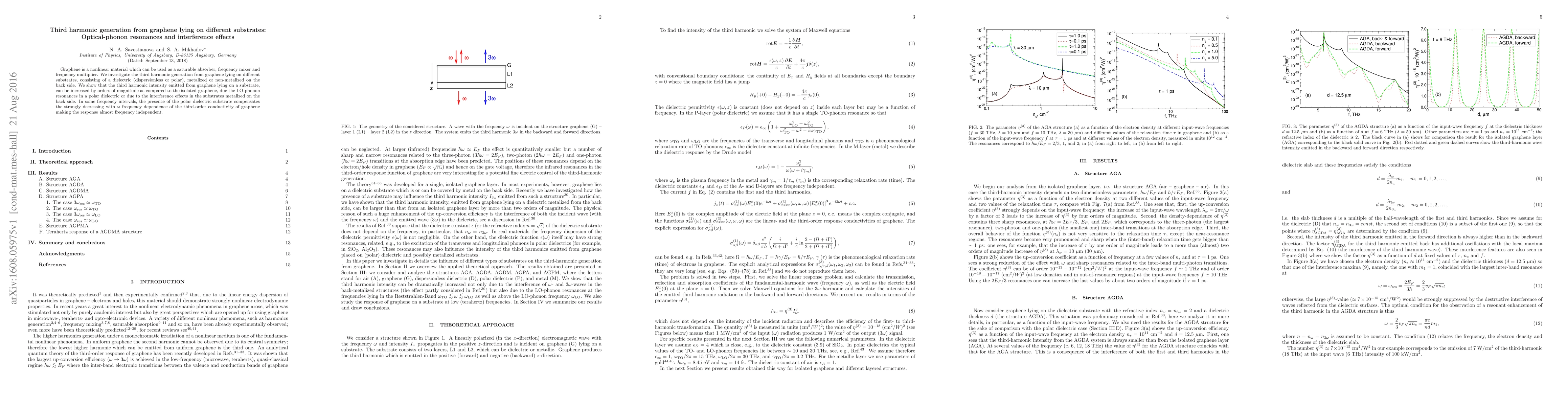 Summary: This paper explores third harmonic generation in graphene on various substrates, revealing significant enhancement due to optical-phonon resonances in polar dielectrics and interference effects in metalized substrates, which can make the response frequency independent over certain intervals.