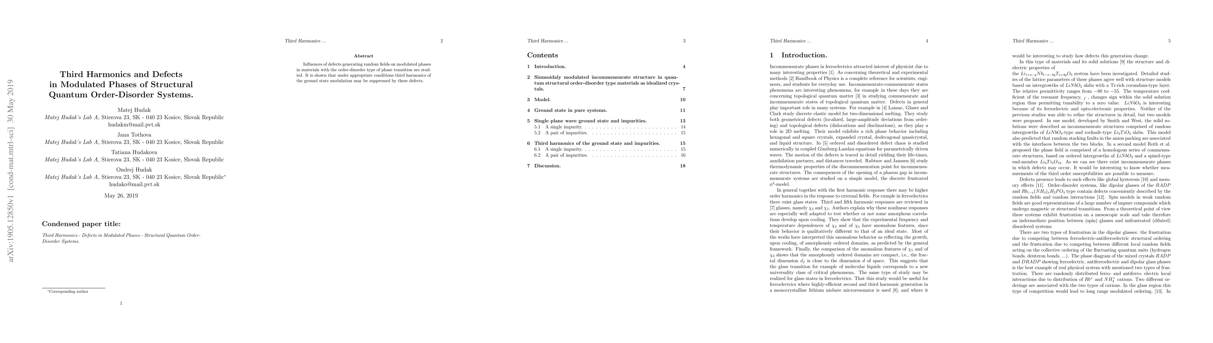 Influences of defects generating random fields on modulated phases in materials with the order-disorder type of phase transition are studied. It is shown that under appropriate conditions third harmonics of the ground state modulation may be suppressed by these defects.