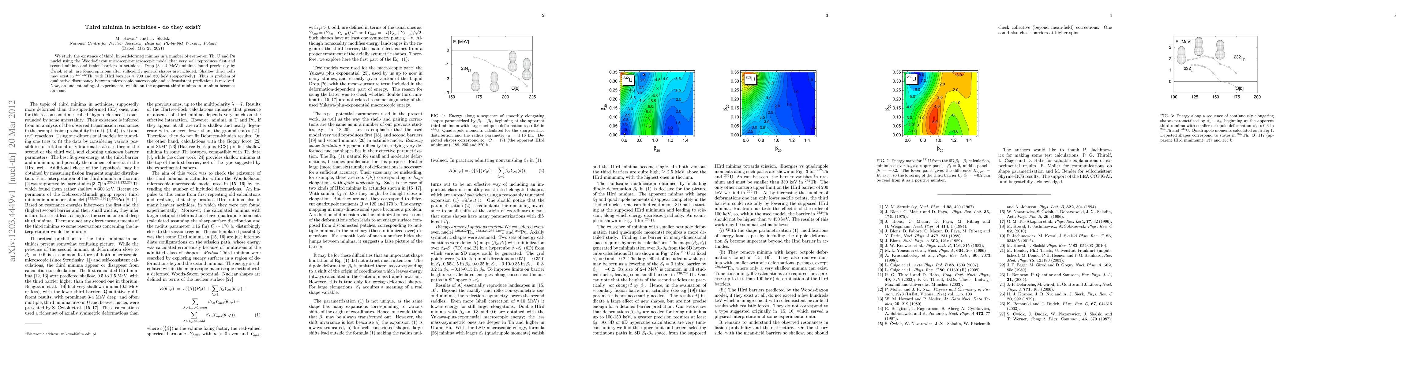 We study the existence of third, hyperdeformed minima in a number of even-even Th, U and Pu nuclei using the Woods-Saxon microscopic-macroscopic model that very well reproduces first and second minima and fission barriers in actinides. Deep ($3 \div 4$ MeV) minima found previously by \'Cwiok et al. are found spurious after sufficiently general shapes are included. Shallow third wells may exist in $^{230,232}$Th, with IIIrd barriers $\le$ 200 and 330 keV (respectively). Thus, a problem of qualitative discrepancy between microscopic-macroscopic and selfconsistent predictions is resolved. Now, an understanding of experimental results on the apparent third minima in uranium becomes an issue.