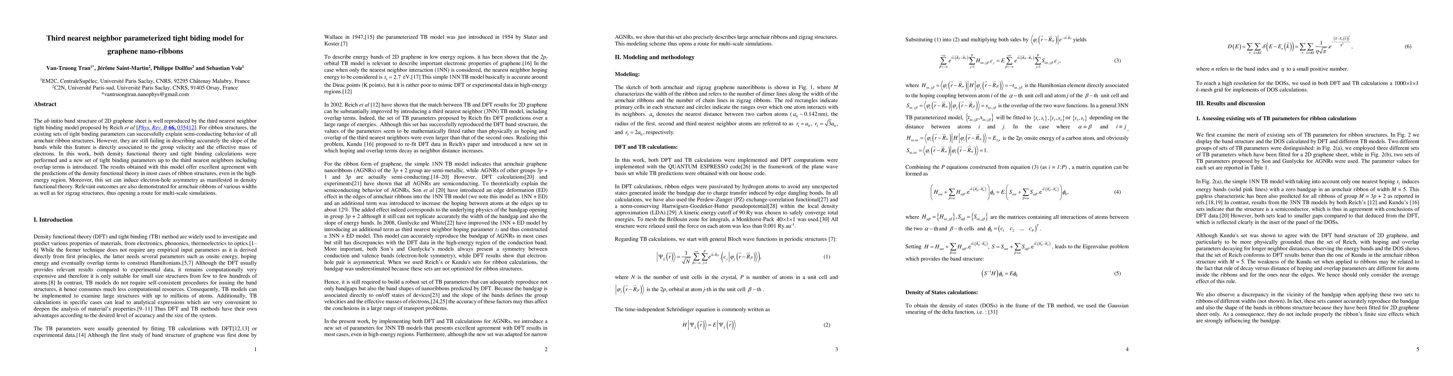 The ab initio band structure of 2D graphene sheet is well reproduced by the third nearest neighbor tight binding model proposed by Reich et al [Phys. Rev. B 66, 035412]. For ribbon structures, the existing sets of tight binding parameters can successfully explain semi-conducting behavior of all armchair ribbon structures. However, they are still failing in describing accurately the slope of the bands while this feature is directly associated to the group velocity and the effective mass of electrons. In this work, both density functional theory and tight binding calculations were performed and a new set of tight binding parameters up to the third nearest neighbors including overlap terms is introduced. The results obtained with this model offer excellent agreement with the predictions of the density functional theory in most cases of ribbon structures, even in the high-energy region. Moreover, this set can induce electron-hole asymmetry as manifested in density functional theory. Relevant outcomes are also demonstrated for armchair ribbons of various widths as well as for zigzag structures, thus opening a route for multi-scale simulations.