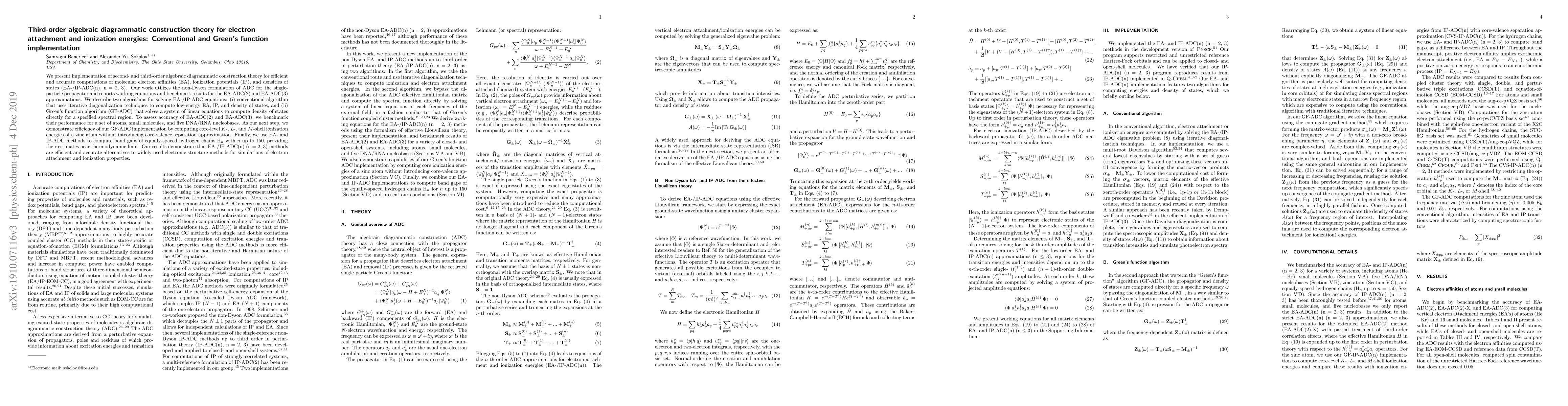 This paper presents implementations of second- and third-order algebraic diagrammatic construction theory for computing electron affinities, ionization potentials, and densities of states. It benchmarks the EA-ADC(2) and EA-ADC(3) methods against various molecules and demonstrates the efficiency of the Green's function algorithm for computing core-level ionization energies without approximations.