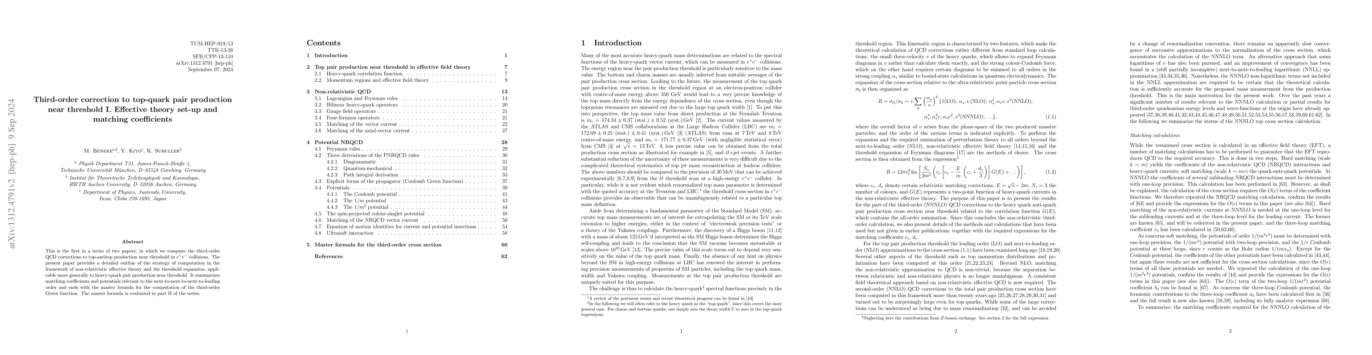 This paper outlines the strategy for computing third-order QCD corrections to top-quark pair production near threshold in e+ e- collisions using non-relativistic effective theory and threshold expansion. It details matching coefficients and potentials for next-to-next-to-next-to-leading order calculations and presents the master formula for third-order Green function computation.