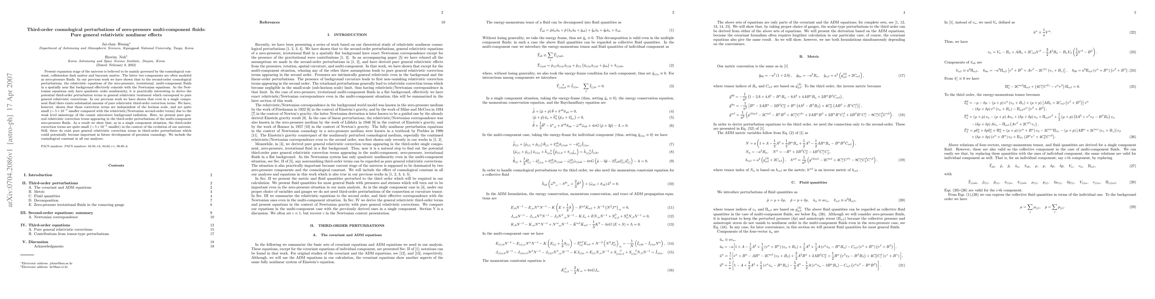 This paper investigates third-order cosmological perturbations of zero-pressure multi-component fluids, revealing small but potentially significant pure general relativistic corrections compared to second-order terms. These corrections, though minor currently, may gain importance in future precision cosmology.