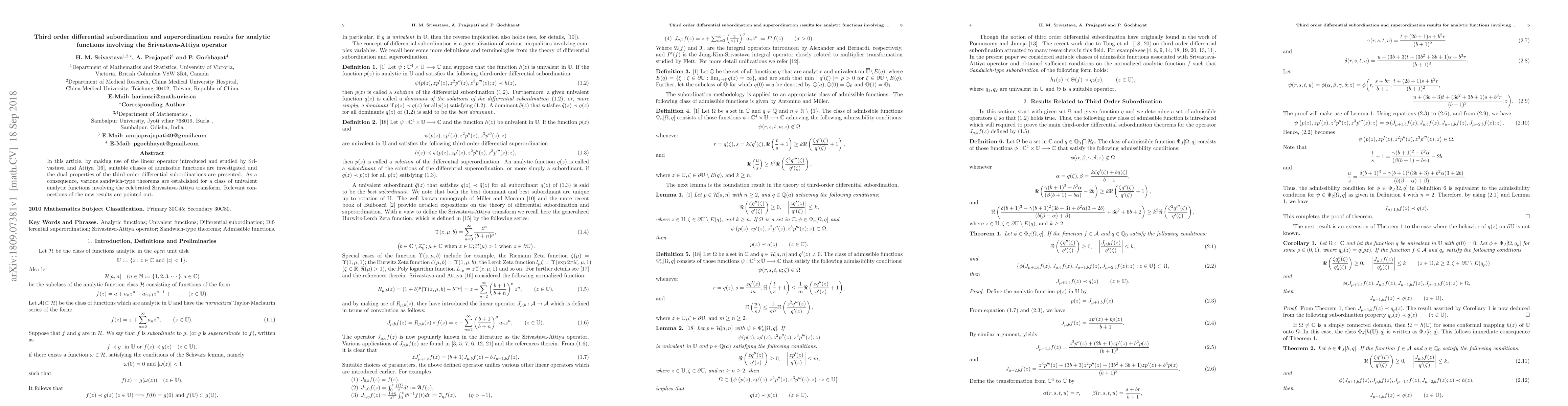 In this article, by making use of the linear operator introduced and studied by Srivastava and Attiya \cite{srivastava1}, suitable classes of admissible functions are investigated and the dual properties of the third-order differential subordinations are presented. As a consequence, various sandwich-type theorems are established for a class of univalent analytic functions involving the celebrated Srivastava-Attiya transform. Relevant connections of the new results are pointed out.