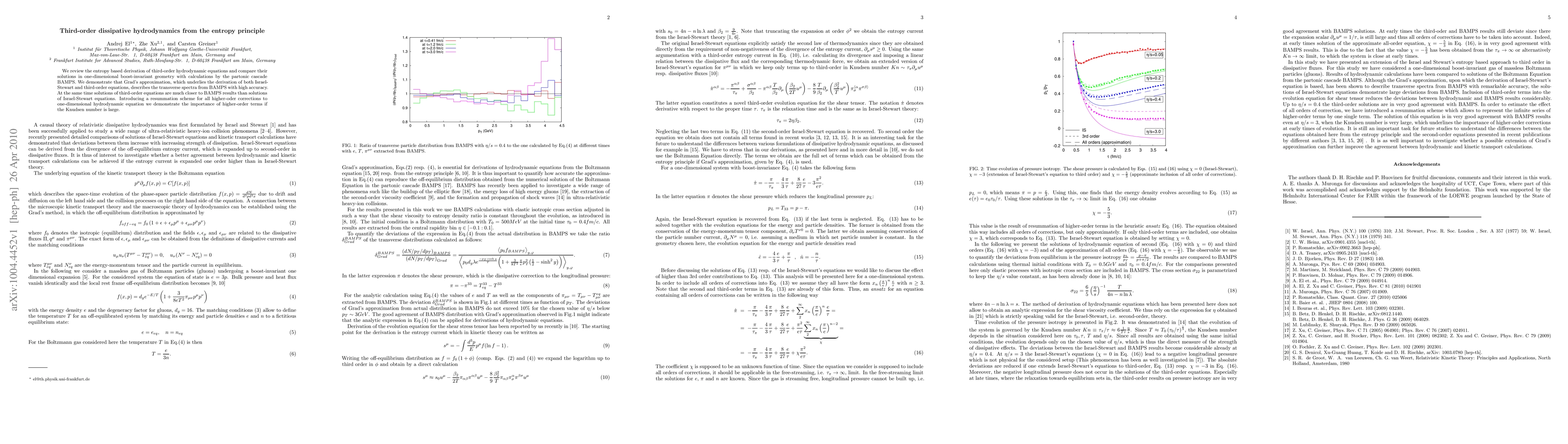 Researchers derived third-order hydrodynamic equations from the entropy principle and found that Grad's approximation accurately describes transverse spectra, while higher-order corrections improve accuracy for large Knudsen numbers.