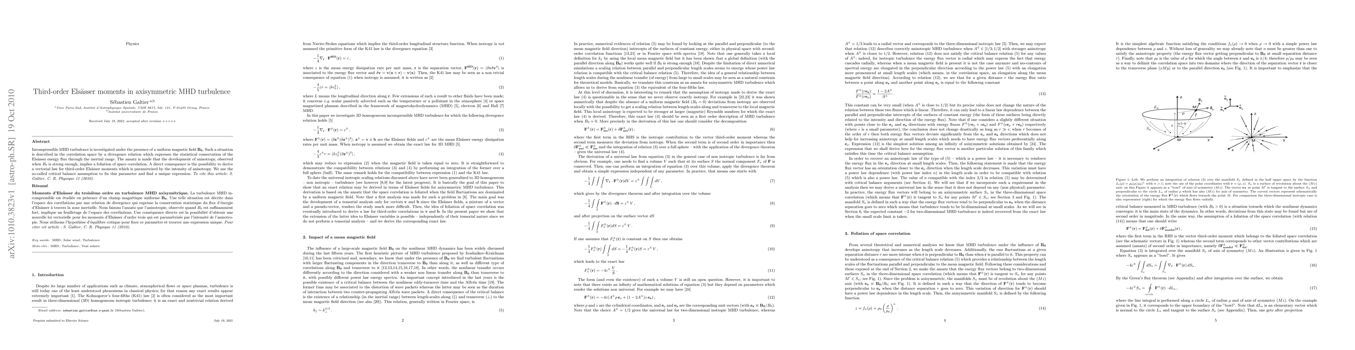 Incompressible MHD turbulence is investigated under the presence of a uniform magnetic field $\bb0$. Such a situation is described in the correlation space by a divergence relation which expresses the statistical conservation of the Els\"asser energy flux through the inertial range. The ansatz is made that the development of anisotropy, observed when $B_0$ is strong enough, implies a foliation of space correlation. A direct consequence is the possibility to derive a vectorial law for third-order Els\"asser moments which is parametrized by the intensity of anisotropy. We use the so-called critical balance assumption to fix this parameter and find a unique expression.