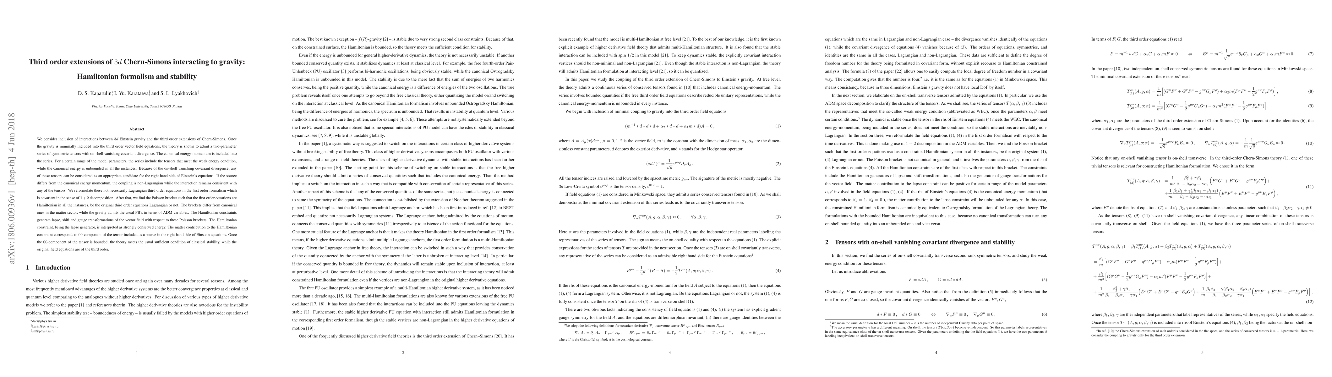 We consider inclusion of interactions between 3d Einstein gravity and the third order extensions of Chern-Simons. Once the gravity is minimally included into the third order vector field equations, the theory is shown to admit a two-parameter series of symmetric tensors with on-shell vanishing covariant divergence. The canonical energy-momentum is included into the series. For a certain range of the model parameters, the series include the tensors that meet the weak energy condition, while the canonical energy is unbounded in all the instances. Because of the on-shell vanishing covariant divergence, any of these tensors can be considered as an appropriate candidate for the right hand side of Einstein's equations. If the source differs from the canonical energy momentum, the coupling is non-Lagrangian while the interaction remains consistent with any of the tensors. We reformulate these not necessarily Lagrangian third order equations in the first order formalism which is covariant in the sense of 1+2 decomposition. After that, we find the Poisson bracket such that the first order equations are Hamiltonian in all the instances, be the original third order equations Lagrangian or not. The brackets differ from canonical ones in the matter sector, while the gravity admits the usual PB's in terms of ADM variables. The Hamiltonian constraints generate lapse, shift and gauge transformations of the vector field with respect to these Poisson brackets. The Hamiltonian constraint, being the lapse generator, is interpreted as strongly conserved energy. The matter contribution to the Hamiltonian constraint corresponds to 00-component of the tensor included as a source in the right hand side of Einstein equations. Once the 00-component of the tensor is bounded, the theory meets the usual sufficient condition of classical stability, while the original field equations are of third order.