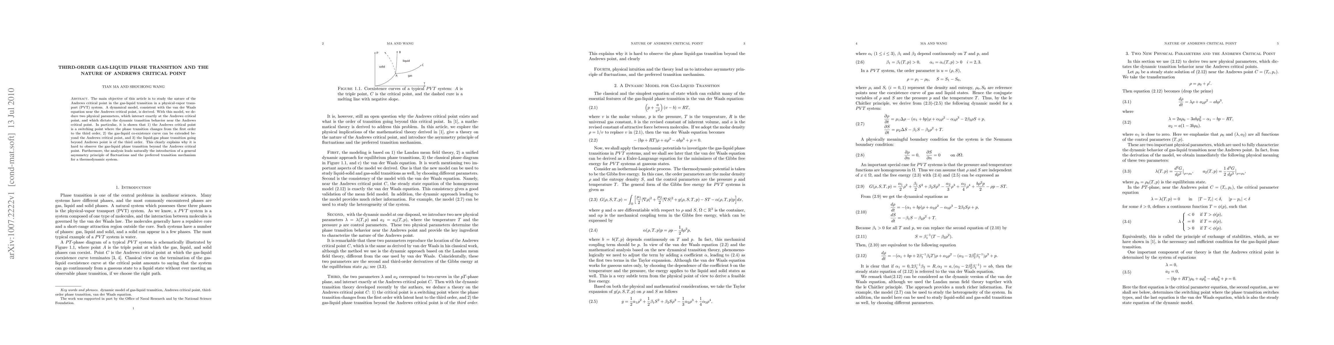 The main objective of this article is to study the nature of the Andrews critical point in the gas-liquid transition in a physical-vapor transport (PVT) system. A dynamical model, consistent with the van der Waals equation near the Andrews critical point, is derived. With this model, we deduce two physical parameters, which interact exactly at the Andrews critical point, and which dictate the dynamic transition behavior near the Andrews critical point. In particular, it is shown that 1) the Andrews critical point is a switching point where the phase transition changes from the first order to the third order, 2) the gas-liquid co-existence curve can be extended beyond the Andrews critical point, and 3) the liquid-gas phase transition going beyond Andrews point is of the third order. This clearly explains why it is hard to observe the gas-liquid phase transition beyond the Andrews critical point. Furthermore, the analysis leads naturally the introduction of a general asymmetry principle of fluctuations and the preferred transition mechanism for a thermodynamic system.