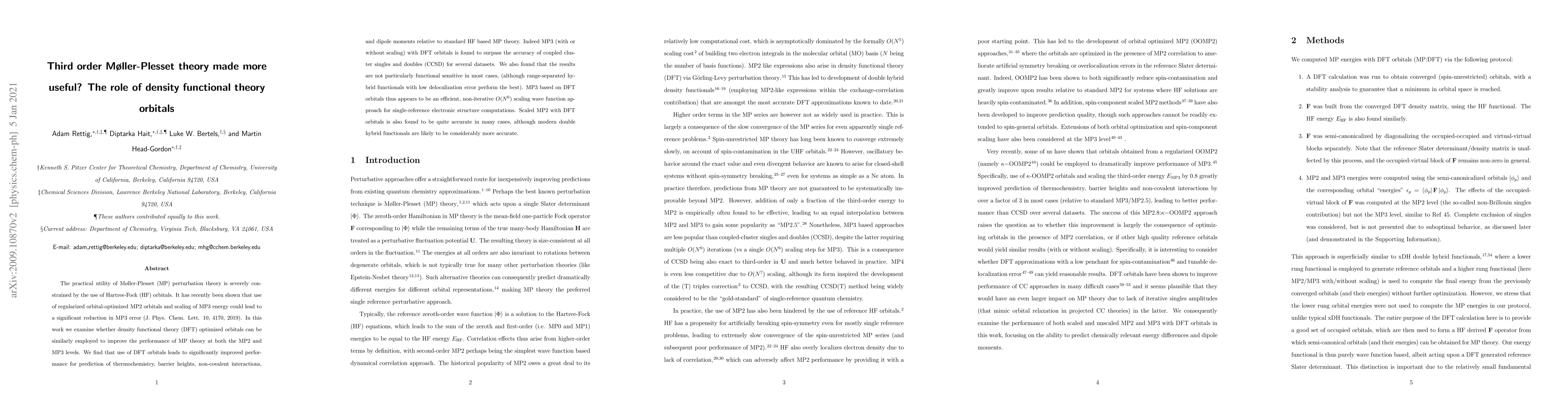 This paper explores the use of density functional theory (DFT) optimized orbitals to enhance the performance of M{\o}ller-Plesset (MP) perturbation theory, finding significant improvements over Hartree-Fock (HF) based MP2 and MP3 for predicting thermochemistry, barrier heights, and more. MP3 with DFT orbitals surpasses coupled cluster singles and doubles (CCSD) accuracy in several cases, indicating it as an efficient non-iterative method for single-reference electronic structure computations.