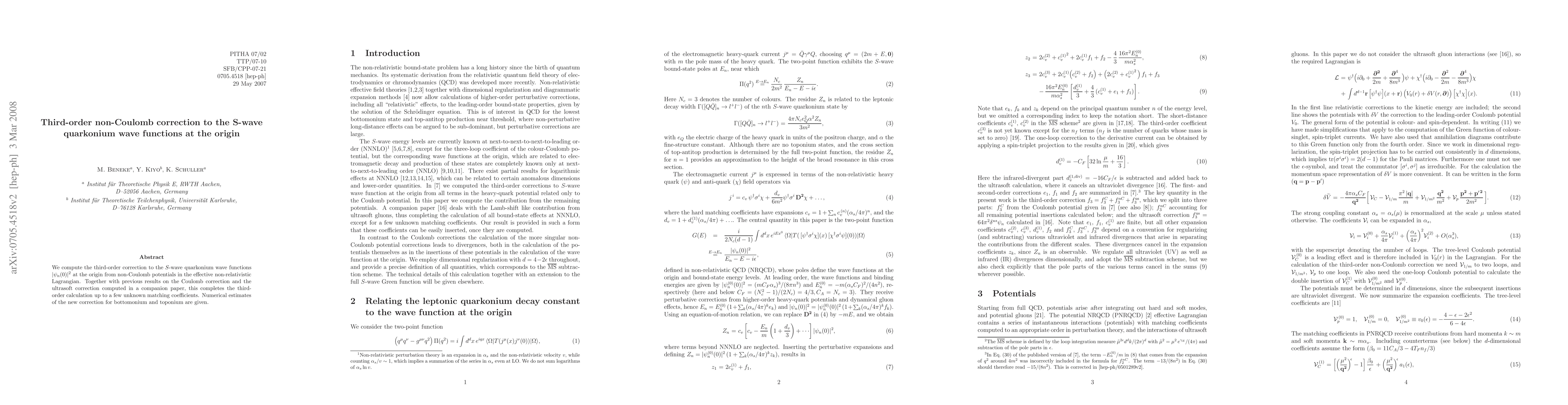 Researchers computed a third-order correction to quarkonium wave functions at the origin from non-Coulomb potentials, completing a calculation with unknown matching coefficients.