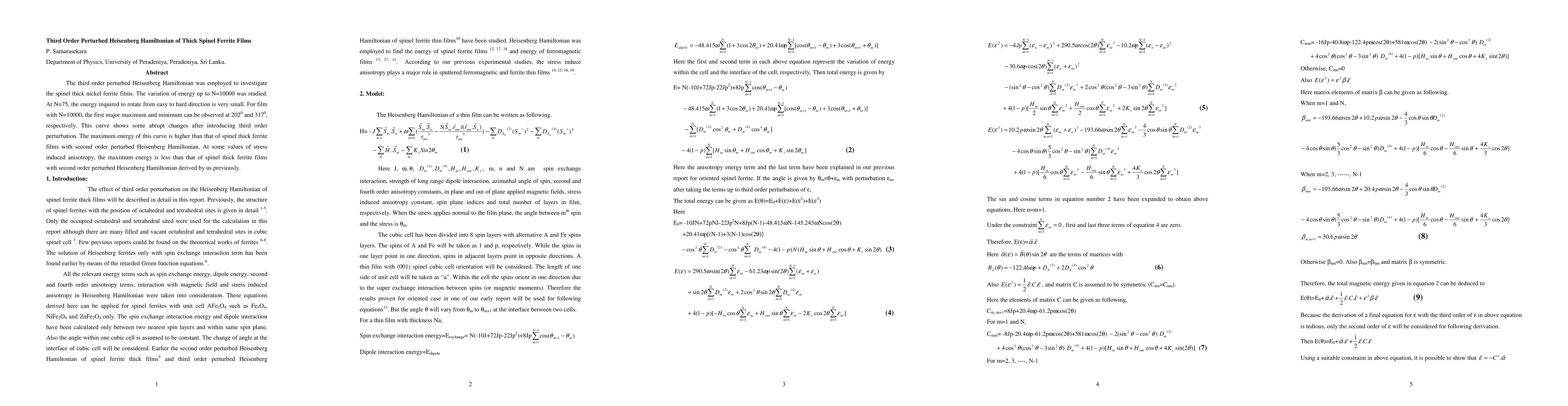 This study uses the third order perturbed Heisenberg Hamiltonian to analyze the energy variations in thick nickel ferrite spinel films, revealing significant changes at N=75 and major energy extrema at N=10000. The results show that the maximum energy is higher than that from second order perturbations, though it can be lower under certain stress-induced anisotropy conditions.