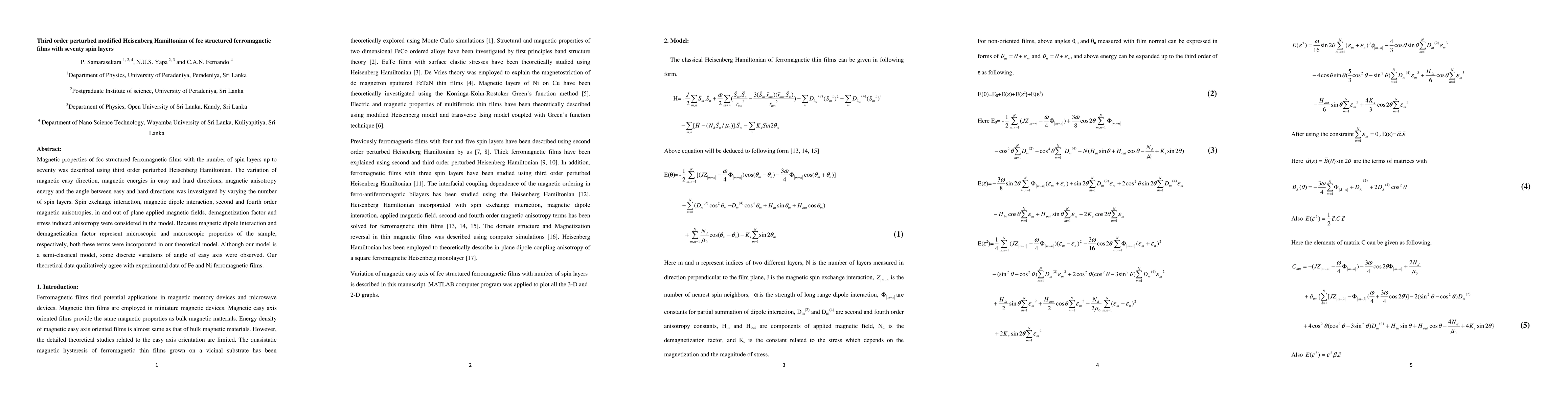 This paper investigates the magnetic properties of fcc structured ferromagnetic films with up to seventy spin layers using a third-order perturbed Heisenberg Hamiltonian. The model considers various interactions and fields, and results qualitatively match experimental data for Fe and Ni films, showing variations in magnetic easy direction and anisotropy energy.