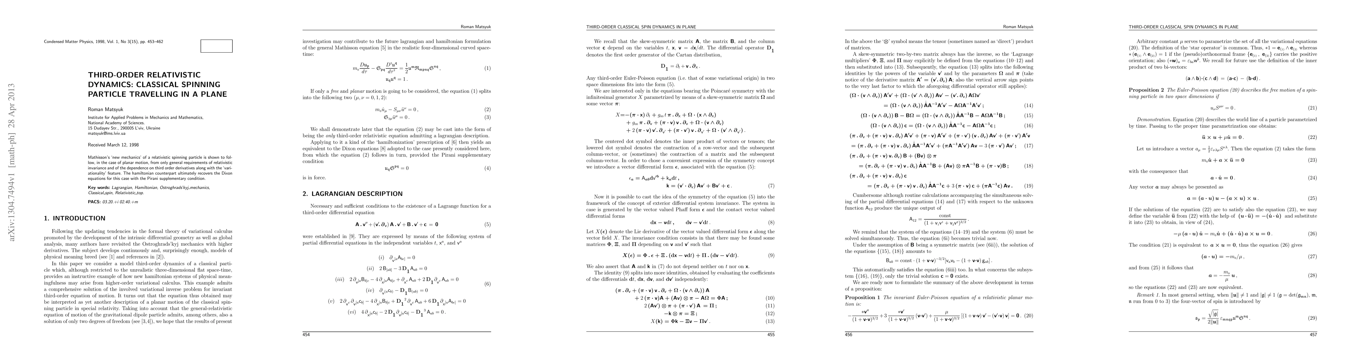This paper derives the dynamics of a relativistic spinning particle moving in a plane using general relativistic invariance, third-order derivative dependence, and variationality, ultimately leading to the Dixon equations with the Mathisson-Pirani condition. The approach provides a Hamiltonian formulation consistent with Mathisson's 'new mechanics'.