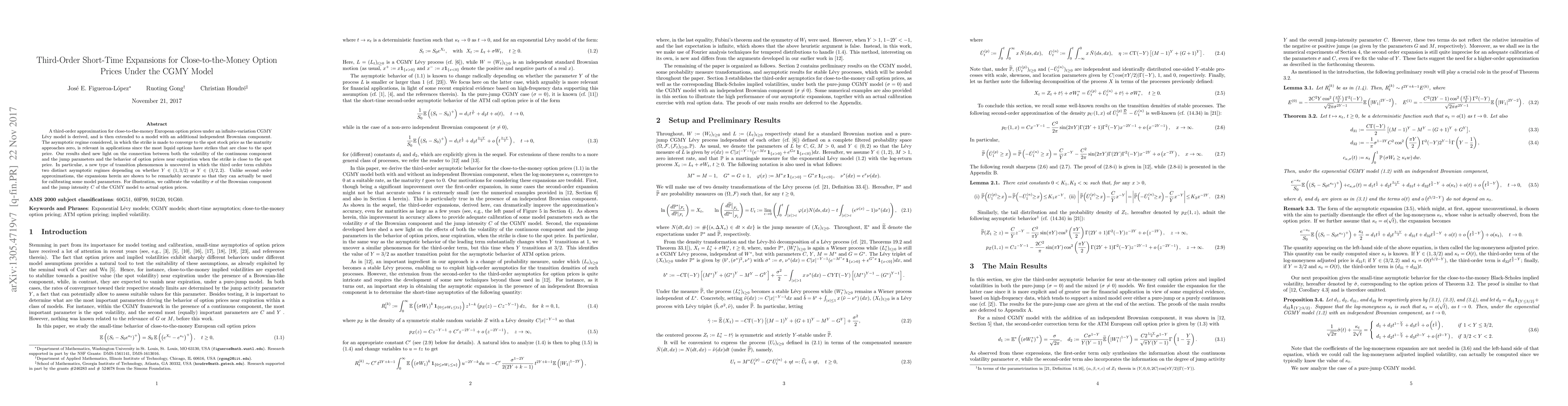 A third-order approximation for close-to-the-money European option prices under an infinite-variation CGMY L\'{e}vy model is derived, and is then extended to a model with an additional independent Brownian component. The asymptotic regime considered, in which the strike is made to converge to the spot stock price as the maturity approaches zero, is relevant in applications since the most liquid options have strikes that are close to the spot price. Our results shed new light on the connection between both the volatility of the continuous component and the jump parameters and the behavior of option prices near expiration when the strike is close to the spot price. In particular, a new type of transition phenomenon is uncovered in which the third order term exhibits two distinct asymptotic regimes depending on whether $Y\in(1,3/2)$ or $Y\in(3/2,2)$. Unlike second order approximations, the expansions herein are shown to be remarkably accurate so that they can actually be used for calibrating some model parameters. For illustration, we calibrate the volatility $\sigma$ of the Brownian component and the jump intensity $C$ of the CGMY model to actual option prices.