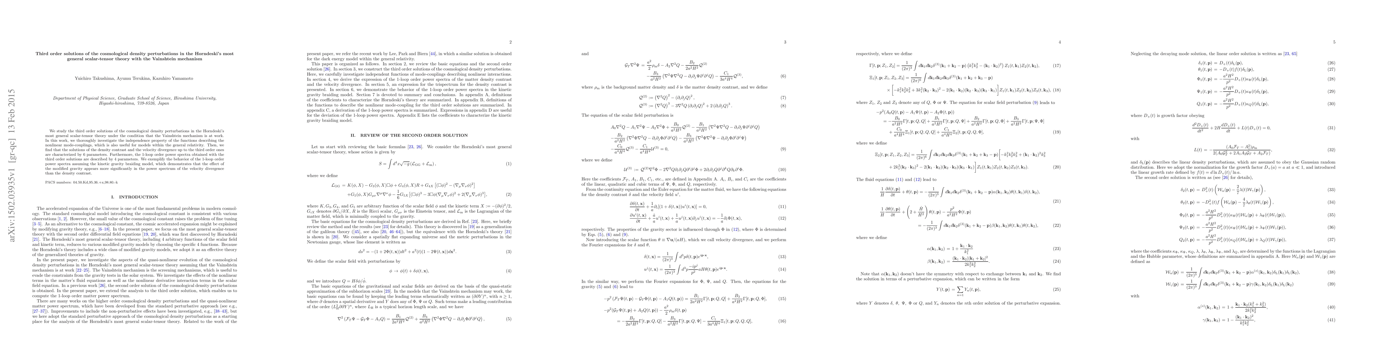 This paper investigates third order solutions for cosmological density perturbations in Horndeski's scalar-tensor theory, focusing on the Vainshtein mechanism. It finds that the solutions are characterized by 6 parameters and the 1-loop power spectra by 4, with the kinetic gravity braiding model showing modified gravity effects more prominently in velocity divergence than density contrast.