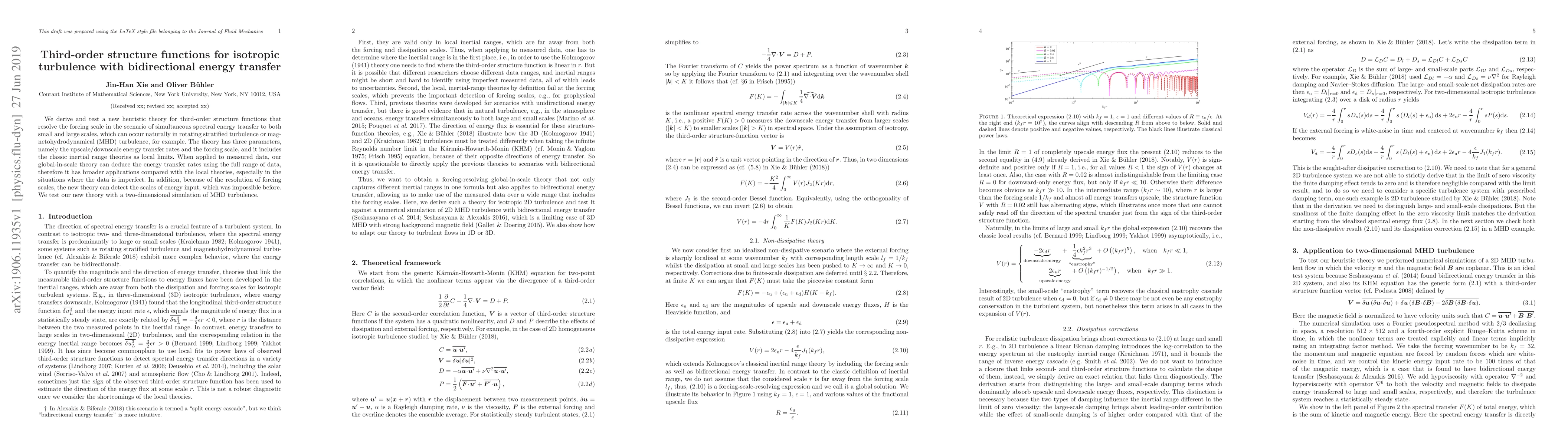 This paper proposes a new heuristic theory for third-order structure functions in isotropic turbulence with bidirectional energy transfer, resolving the forcing scale. The theory, with three parameters, extends classic inertial range theories and can deduce energy transfer rates from full data, offering broader applications, especially in imperfect data scenarios.