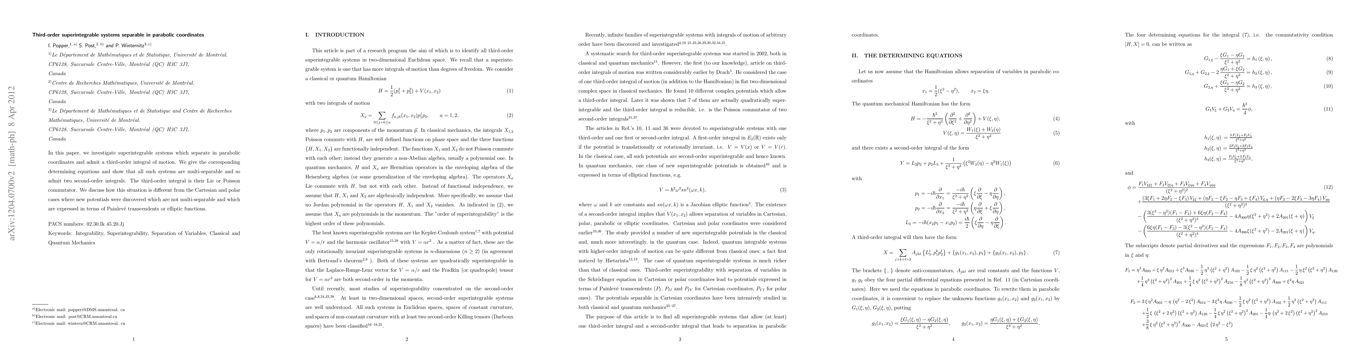 This paper explores third-order superintegrable systems that separate in parabolic coordinates, revealing they are multi-separable with two second-order integrals, and their third-order integral is derived from their Lie or Poisson commutator. Unlike Cartesian and polar cases, these systems do not involve new potentials expressed in terms of Painlevé transcendents or elliptic functions.