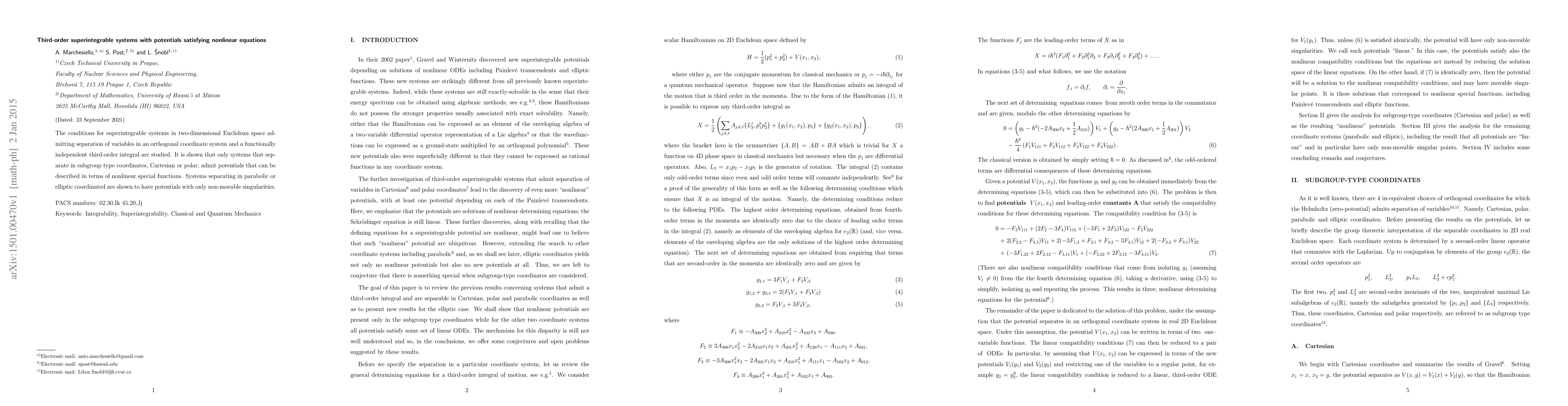 The conditions for superintegrable systems in two-dimensional Euclidean space admitting separation of variables in an orthogonal coordinate system and a functionally independent third-order integral are studied. It is shown that only systems that separate in subgroup type coordinates, Cartesian or polar, admit potentials that can be described in terms of nonlinear special functions. Systems separating in parabolic or elliptic coordinated are shown to have potentials with only non-movable singularities.