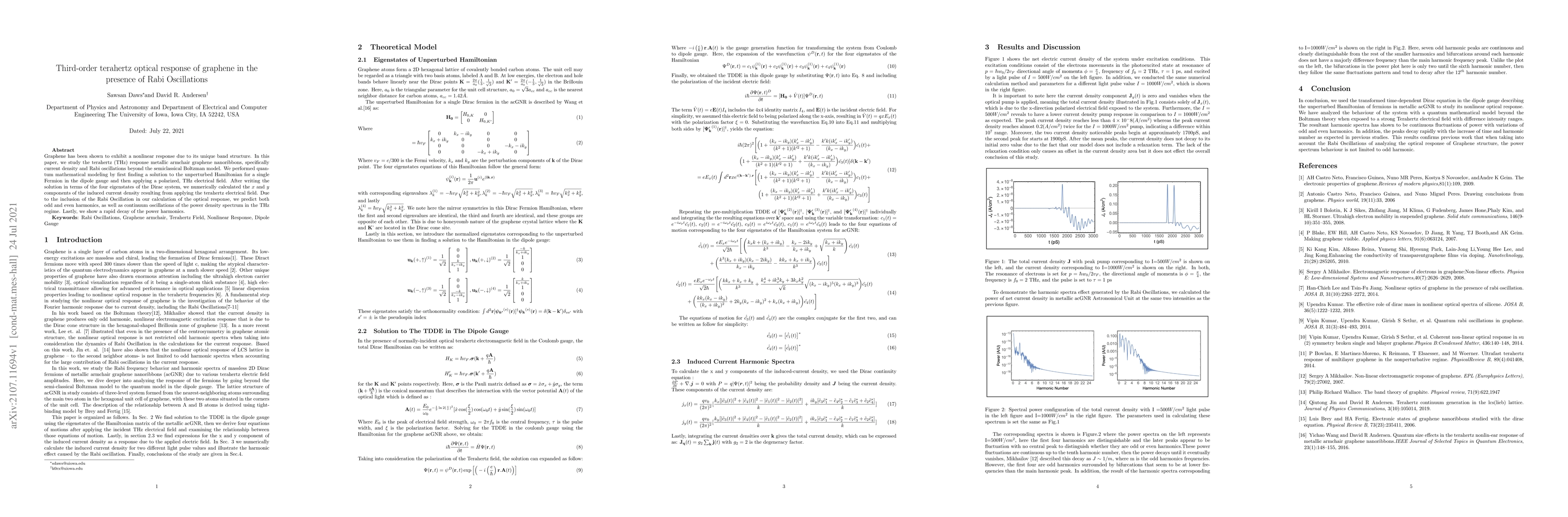 Graphene has been shown to exhibit a nonlinear response due to its unique band structure. In this paper, we study the terahertz (THz) response metallic armchair graphene nanoribbons, specifically current density and Rabi oscillations beyond the semiclassical Boltzman model. We performed quantum mathematical modeling by first finding a solution to the unperturbed Hamiltonian for a single Fermion in the dipole gauge and then applying a polarized, THz electrical field. After writing the solution in terms of the four eigenstates of the Dirac system, we numerically calculated the $x$ and $y$ components of the induced current density resulting from applying the terahertz electrical field. Due to the inclusion of the Rabi Oscillation in our calculation of the optical response, we predict both odd and even harmonics, as well as continuum oscillations of the power density spectrum in the THz regime. Lastly, we show a rapid decay of the power harmonics.