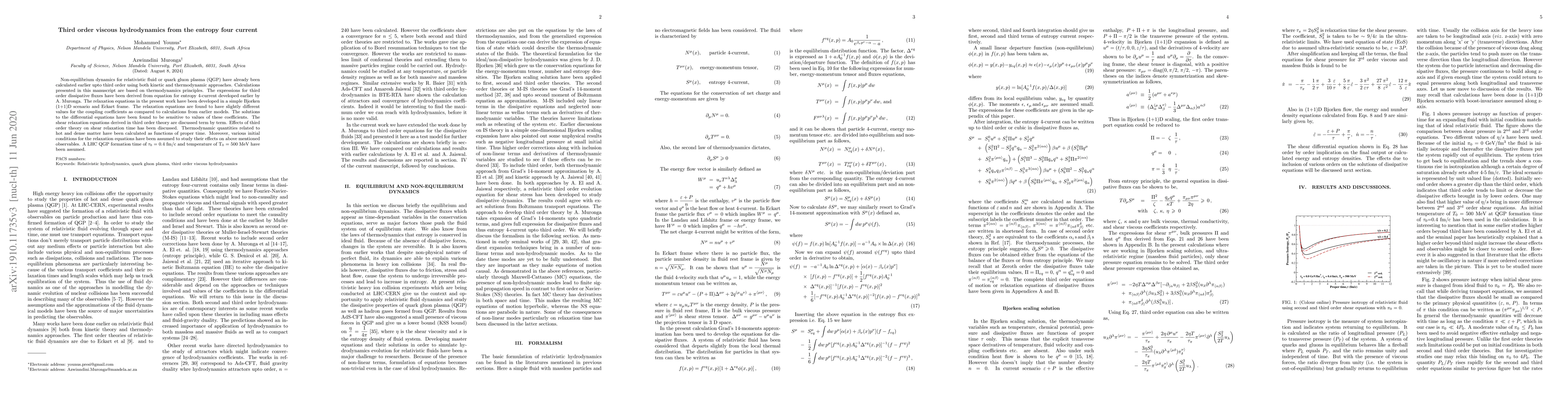 Non-equilibrium dynamics for relativistic fluid or quark gluon plasma (QGP) have already been calculated earlier upto third order using both kinetic and thermodynamic approaches. Calculations presented in this manuscript are based on thermodynamics principles. The expressions for third order dissipative fluxes have been derived from equation for entropy 4-current developed earlier by A. Muronga. The relaxation equations in the present work have been developed in a simple Bjorken (1+1)D scenario and Eckart frame. The relaxation equations are found to have slightly different values for the coupling coefficients as compared to calculations from earlier models. The solutions to the differential equations have been found to be sensitive to values of these coefficients. The shear relaxation equations derived in third order theory are discussed term by term. Effects of third order theory on shear relaxation time has been discussed. Thermodynamic quantities related to hot and dense matter have been calculated as functions of proper time. Moreover, various initial conditions for the relaxation equations have been assumed to study their effects on above mentioned observables. A LHC QGP formation time of $\tau_0$ = 0.4 fm/c and temperature of T$_0$ = 500 MeV have been assumed.