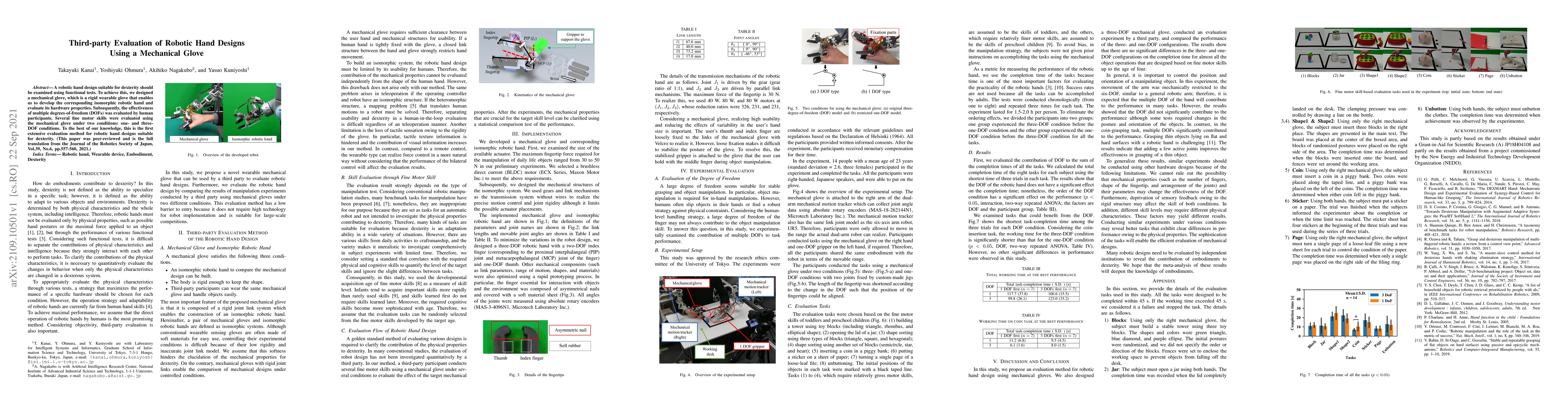 A robotic hand design suitable for dexterity should be examined using functional tests. To achieve this, we designed a mechanical glove, which is a rigid wearable glove that enables us to develop the corresponding isomorphic robotic hand and evaluate its hardware properties. Subsequently, the effectiveness of multiple degrees-of-freedom (DOFs) was evaluated by human participants. Several fine motor skills were evaluated using the mechanical glove under two conditions: one- and three-DOF conditions. To the best of our knowledge, this is the first extensive evaluation method for robotic hand designs suitable for dexterity. (This paper was peer-reviewed and is the full translation from the Journal of the Robotics Society of Japan, Vol.39, No.6, pp.557-560, 2021.)