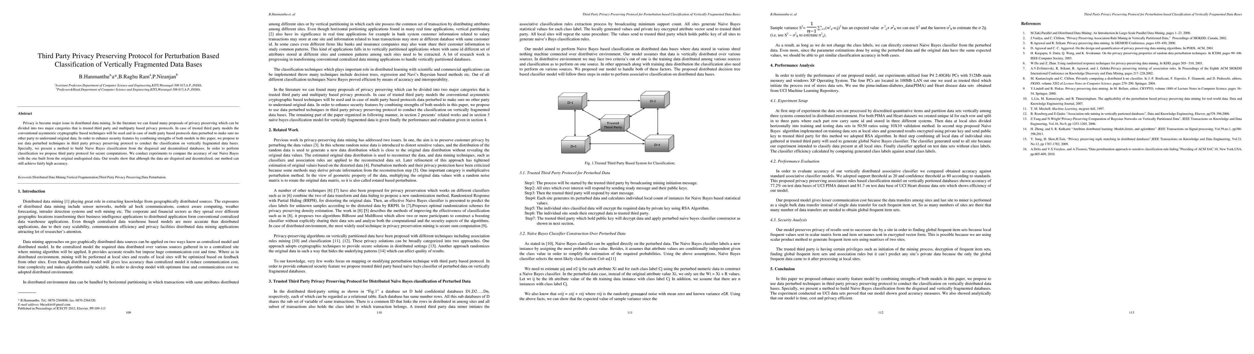 Privacy is become major issue in distributed data mining. In the literature we can found many proposals of privacy preserving which can be divided into two major categories that is trusted third party and multiparty based privacy protocols. In case of trusted third party models the conventional asymmetric cryptographic based techniques will be used and in case of multi party based protocols data perturbed to make sure no other party to understand original data. In order to enhance security features by combining strengths of both models in this paper, we propose to use data perturbed techniques in third party privacy preserving protocol to conduct the classification on vertically fragmented data bases. Specially, we present a method to build Naive Bayes classification from the disguised and decentralized databases. In order to perform classification we propose third party protocol for secure computations. We conduct experiments to compare the accuracy of our Naive Bayes with the one built from the original undisguised data. Our results show that although the data are disguised and decentralized, our method can still achieve fairly high accuracy.