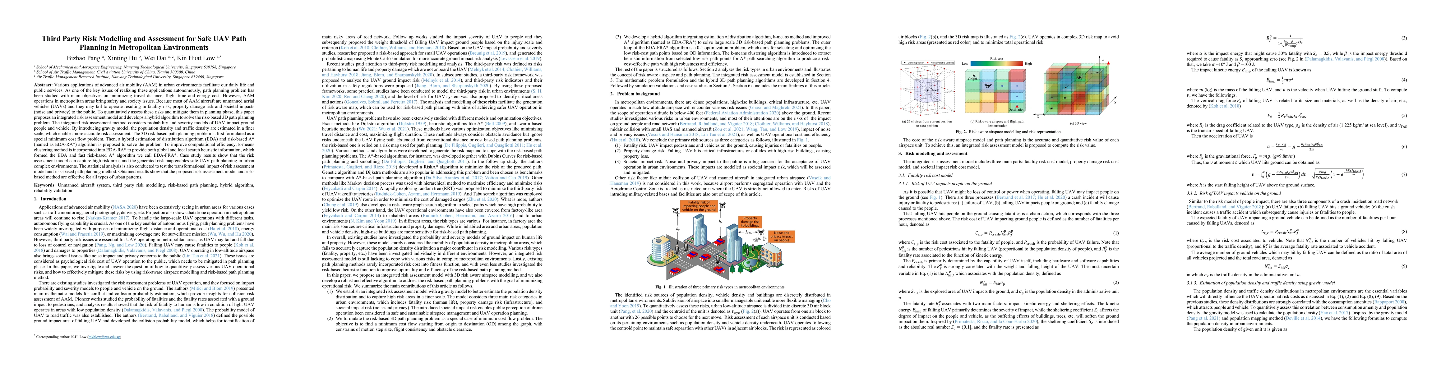 Various applications of advanced air mobility (AAM) in urban environments facilitate our daily life and public services. As one of the key issues of realizing these applications autonomously, path planning problem has been studied with main objectives on minimizing travel distance, flight time and energy cost. However, AAM operations in metropolitan areas bring safety and society issues. Because most of AAM aircraft are unmanned aerial vehicles (UAVs) and they may fail to operate resulting in fatality risk, property damage risk and societal impacts (noise and privacy) to the public. To quantitatively assess these risks and mitigate them in planning phase, this paper proposes an integrated risk assessment model and develops a hybrid algorithm to solve the risk-based 3D path planning problem. The integrated risk assessment method considers probability and severity models of UAV impact ground people and vehicle. By introducing gravity model, the population density and traffic density are estimated in a finer scale, which enables more accurate risk assessment. The 3D risk-based path planning problem is first formulated as a special minimum cost flow problem. Then, a hybrid estimation of distribution algorithm (EDA) and risk-based A* (named as EDA-RA*) algorithm is proposed to solve the problem. To improve computational efficiency, k-means clustering method is incorporated into EDA-RA* to provide both global and local search heuristic information, which formed the EDA and fast risk-based A* algorithm we call EDA-FRA*. Case study results show that the risk assessment model can capture high risk areas and the generated risk map enables safe UAV path planning in urban complex environments.