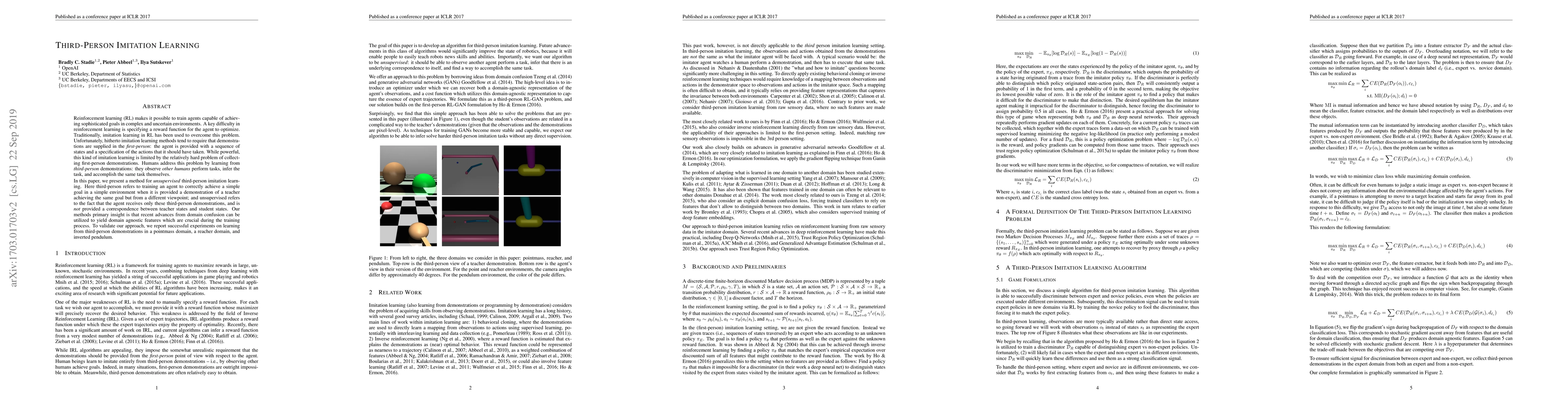 This paper introduces a method for unsupervised third-person imitation learning, enabling agents to achieve goals by observing demonstrations from a different viewpoint without state correspondence. It leverages domain confusion techniques to extract domain-agnostic features, validated through successful experiments in pointmass, reacher, and inverted pendulum environments.