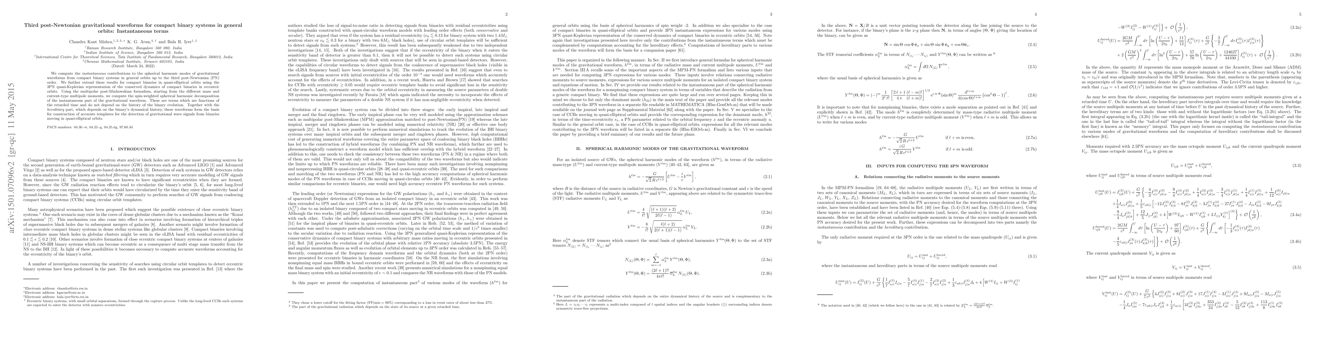 This paper calculates the instantaneous post-Newtonian contributions to gravitational waveforms from compact binary systems in general orbits up to third post-Newtonian order. It also extends these results for quasi-elliptical orbits using a quasi-Keplerian representation, aiming to develop accurate templates for detecting gravitational waves from such systems.