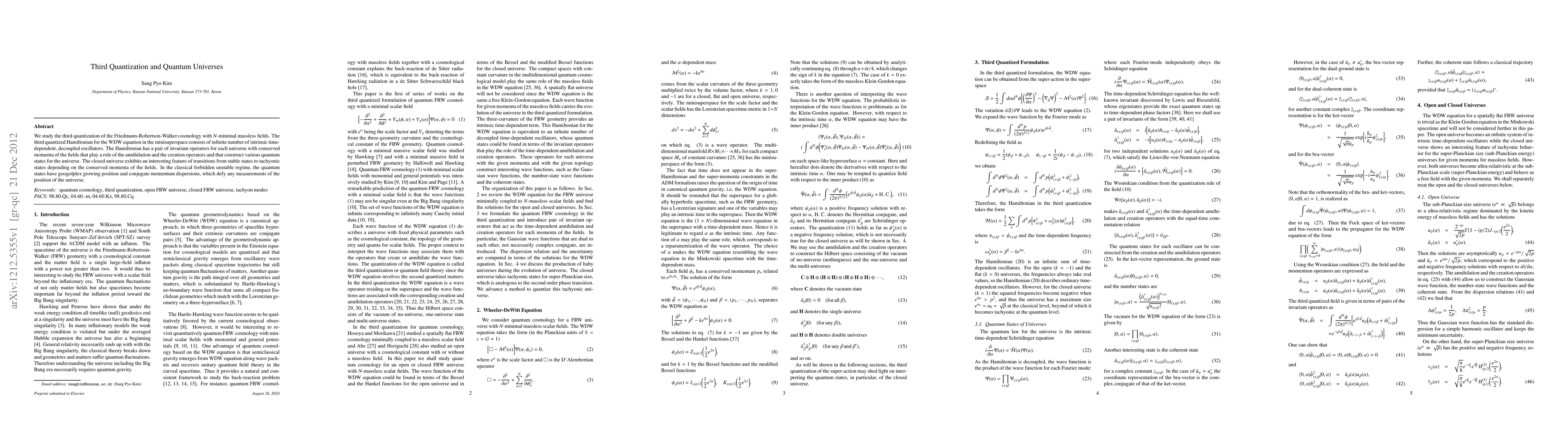 We study the third quantization of the Friedmann-Robertson-Walker cosmology with $N$-minimal massless fields. The third quantized Hamiltonian for the WDW equation in the minisuperspace consists of infinite number of intrinsic time-dependent, decoupled oscillators. The Hamiltonian has a pair of invariant operators for each universe with conserved momenta of the fields that play a role of the annihilation and the creation operators and that construct various quantum states for the universe. The closed universe exhibits an interesting feature of transitions from stable states to tachyonic states depending on the conserved momenta of the fields. In the classical forbidden unstable regime, the quantum states have googolplex growing position and conjugate momentum dispersions, which defy any measurements of the position of the universe.