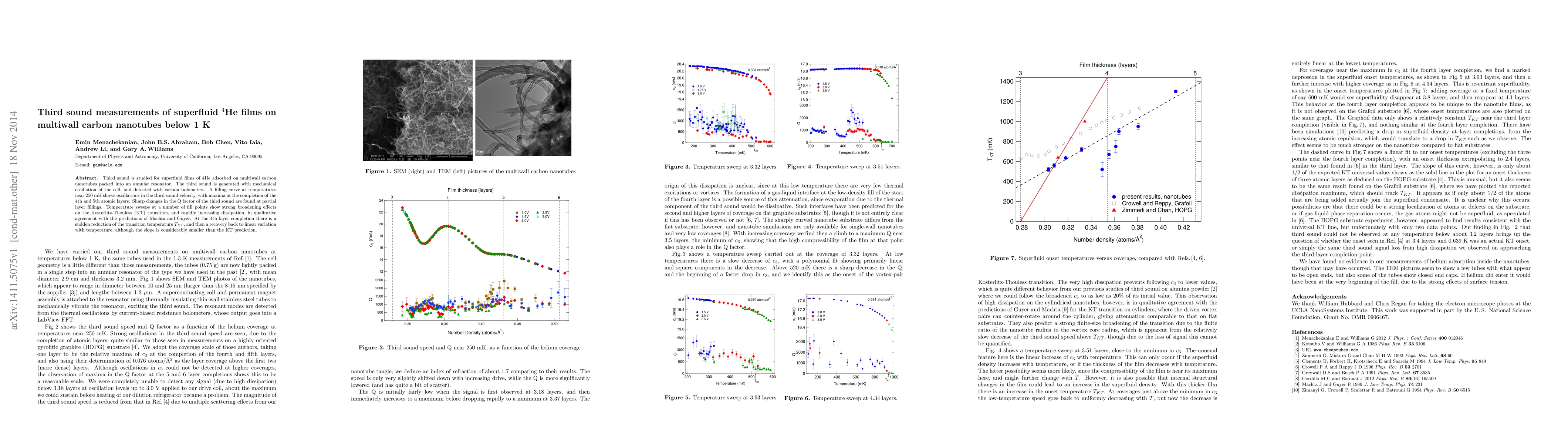 Third sound is studied for superfluid films of 4He adsorbed on multiwall carbon nanotubes packed into an annular resonator. The third sound is generated with mechanical oscillation of the cell, and detected with carbon bolometers. A filling curve at temperatures near 250 mK shows oscillations in the third sound velocity, with maxima at the completion of the 4th and 5th atomic layers. Sharp changes in the Q factor of the third sound are found at partial layer fillings. Temperature sweeps at a number of fill points show strong broadening effects on the Kosterlitz-Thouless (KT) transition, and rapidly increasing dissipation, in qualitative agreement with the predictions of Machta and Guyer. At the 4th layer completion there is a sudden reduction of the transition temperature $T_{KT}$, and then a recovery back to linear variation with temperature, although the slope is considerably smaller than the KT prediction. Some of these effects may be related to changes in the gas-liquid coexistence regions.