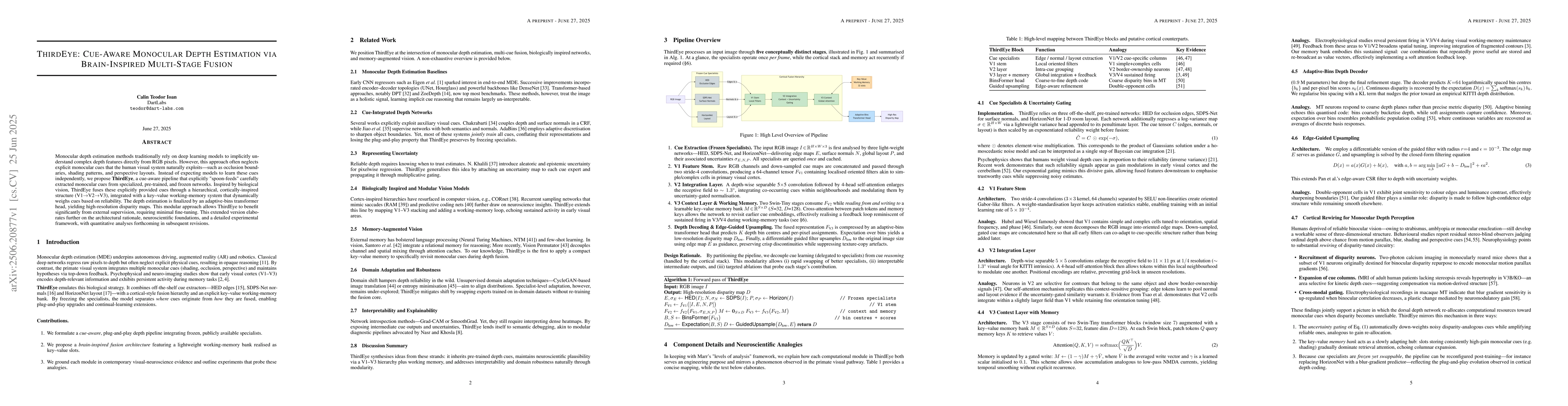 Monocular depth estimation methods traditionally train deep models to infer depth directly from RGB pixels. This implicit learning often overlooks explicit monocular cues that the human visual system relies on, such as occlusion boundaries, shading, and perspective. Rather than expecting a network to discover these cues unaided, we present ThirdEye, a cue-aware pipeline that deliberately supplies each cue through specialised, pre-trained, and frozen networks. These cues are fused in a three-stage cortical hierarchy (V1->V2->V3) equipped with a key-value working-memory module that weights them by reliability. An adaptive-bins transformer head then produces a high-resolution disparity map. Because the cue experts are frozen, ThirdEye inherits large amounts of external supervision while requiring only modest fine-tuning. This extended version provides additional architectural detail, neuroscientific motivation, and an expanded experimental protocol; quantitative results will appear in a future revision.