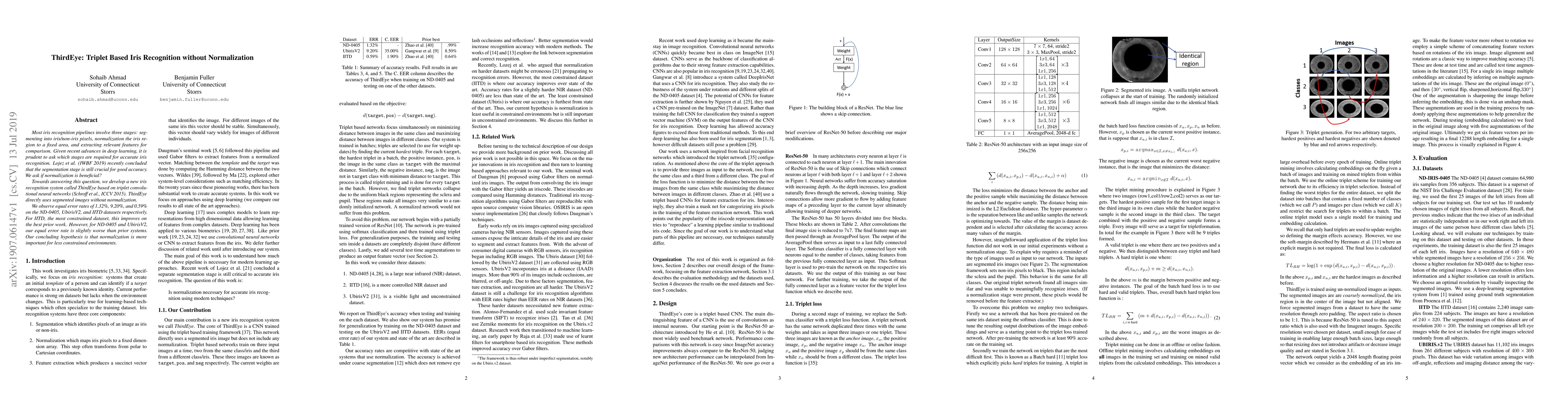 ThirdEye, a triplet-based CNN for iris recognition using segmented images without normalization, demonstrating competitive performance on tested datasets.