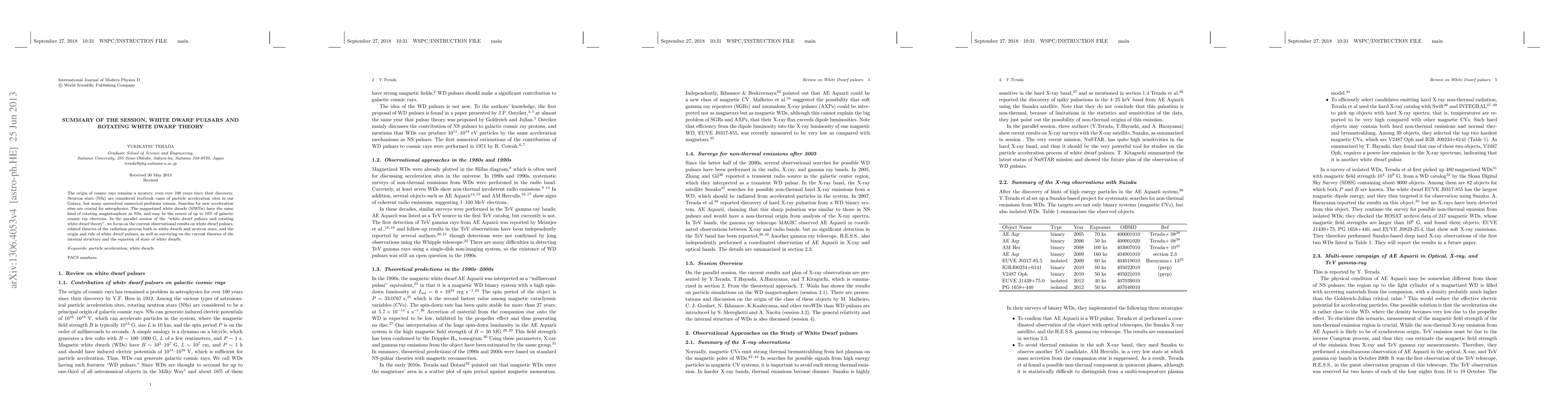 This is the summary of the parallel session entitled "White Dwarf Pulsars and Rotating White Dwarf Theory", chaired by Yukikatsu Terada in Thirteenth Marcel Grossmann Meeting. The origin of cosmic rays remains a mystery, even over 100 years since their discovery. Neutron stars (NSs) are considered textbook cases of particle acceleration sites in our Galaxy, but many unresolved numerical problems remain. Searches for new acceleration sites are crucial for astrophysics. The magnetized white dwarfs (MWDs) have the same kind of rotating magnetosphere as NSs, and may be the source of up to 10% of galactic cosmic ray electrons. In the parallel session of the "white dwarf pulsars and rotating white dwarf theory", we focus on the current observational results on white dwarf pulsars, related theories of the radiation process both in white dwarfs and neutron stars, and the origin and rule of white dwarf pulsars, as well as surveying on the current theories of the internal structure and the equation of state of white dwarfs.