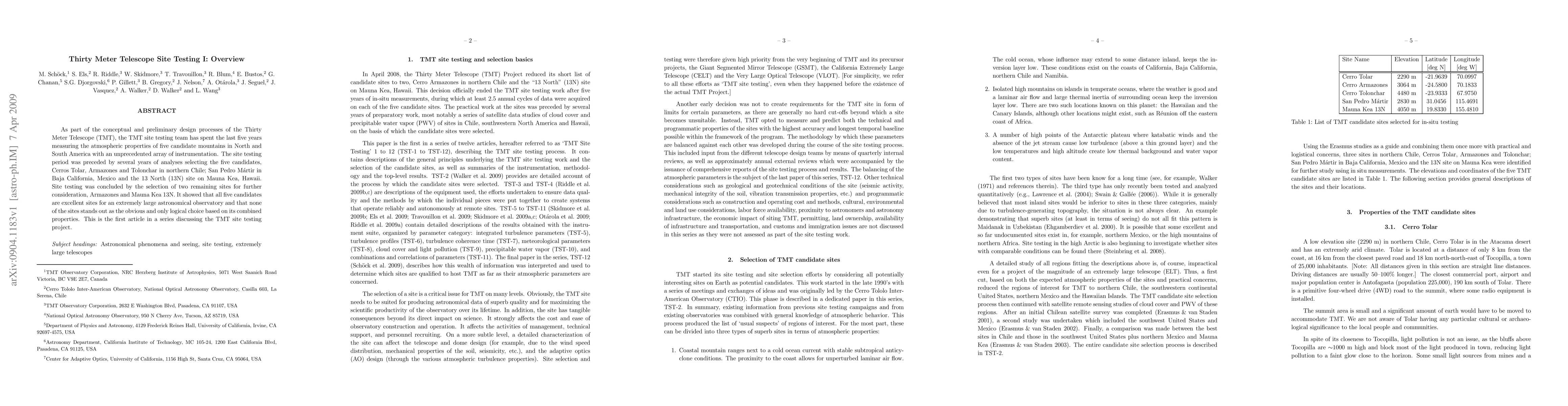 This paper provides an overview of the site testing for the Thirty Meter Telescope (TMT), detailing five years of atmospheric property measurements across five candidate mountain sites in North and South America. The testing concluded with the selection of Armazones and Mauna Kea 13N for further consideration, highlighting that all sites were excellent but none stood out as the clear choice.