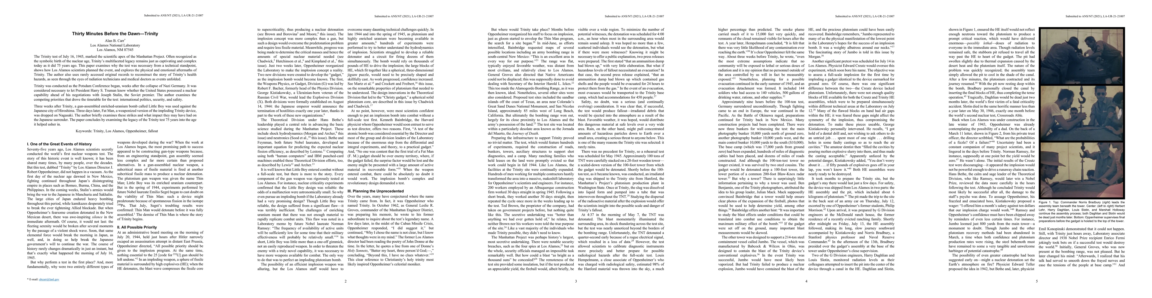 The Trinity test of July 16, 1945 marked the scientific apex of the Manhattan Project. Often recognized as the symbolic birth of the nuclear age, Trinity's multifaceted legacy remains just as captivating and complex as it did 75 years ago. This paper examines why the test was necessary from a technical standpoint, shows how Los Alamos scientists planned the event, and explores the physical and emotional aftermaths of Trinity. The author also uses rarely accessed original records to reconstruct the story of Trinity's health hazards, as seen through the eyes of radiation technicians and medical doctors as events unfolded. Trinity was conducted as the Potsdam Conference began, weeks after the collapse of Nazi Germany. It was considered necessary to let President Harry S. Truman know whether the United States possessed a nuclear capability ahead of his negotiations with Joseph Stalin, the Soviet premier. The author examines the competing priorities that drove the timetable for the test: international politics, security and safety. Three weeks after Trinity, a gun-assembled enriched-uranium bomb called Little Boy was used against the Japanese city of Hiroshima. Three days later, Fat Man, a weaponized version of the imploding Trinity device, was dropped on Nagasaki. The author briefly examines these strikes and what impact they may have had on the Japanese surrender. The paper concludes by examining the legacy of the Trinity test 75 years into the age it helped usher in.