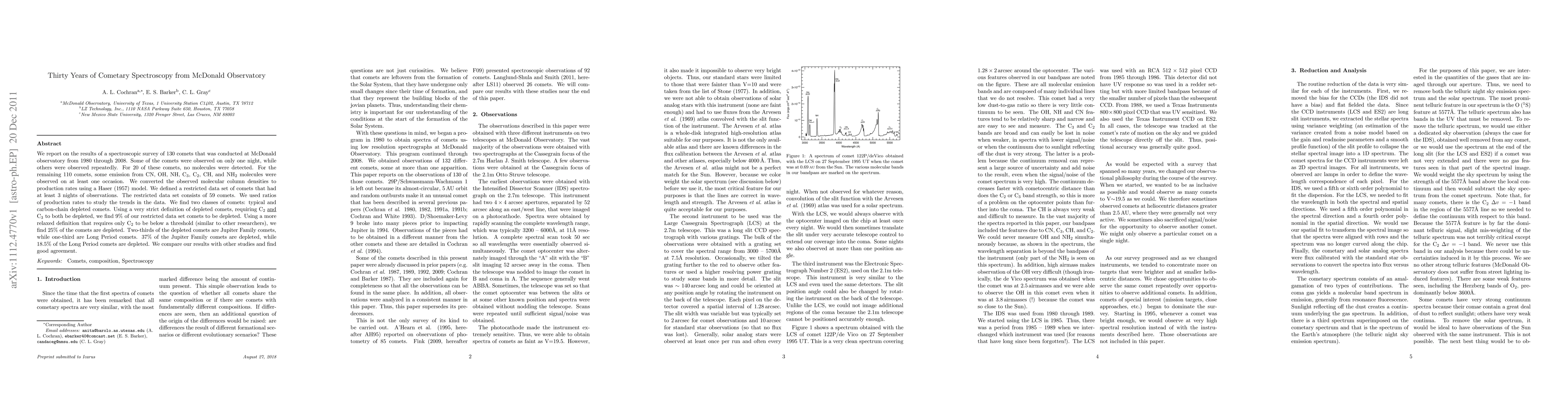 We report on the results of a spectroscopic survey of 130 comets that was conducted at McDonald observatory from 1980 through 2008. Some of the comets were observed on only one night, while others were observed repeatedly. For 20 of these comets, no molecules were detected. For the remaining 110 comets, some emission from CN, OH, NH, C$_{3}$, C$_{2}$, CH, and NH$_{2}$ molecules were observed on at least one occasion. We converted the observed molecular column densities to production rates using a Haser (1957) model. We defined a restricted data set of comets that had at least 3 nights of observations. The restricted data set consists of 59 comets. We used ratios of production rates to study the trends in the data. We find two classes of comets: typical and carbon-chain depleted comets. Using a very strict definition of depleted comets, requiring C$_{2}$ \underline{and} C$_{3}$ to both be depleted, we find 9% of our restricted data set comets to be depleted. Using a more relaxed definition that requires only C$_{2}$ to be below a threshold (similar to other researchers), we find 25% of the comets are depleted. Two-thirds of the depleted comets are Jupiter Family comets, while one-third are Long Period comets. 37% of the Jupiter Family comets are depleted, while 18.5% of the Long Period comets are depleted. We compare our results with other studies and find good agreement.