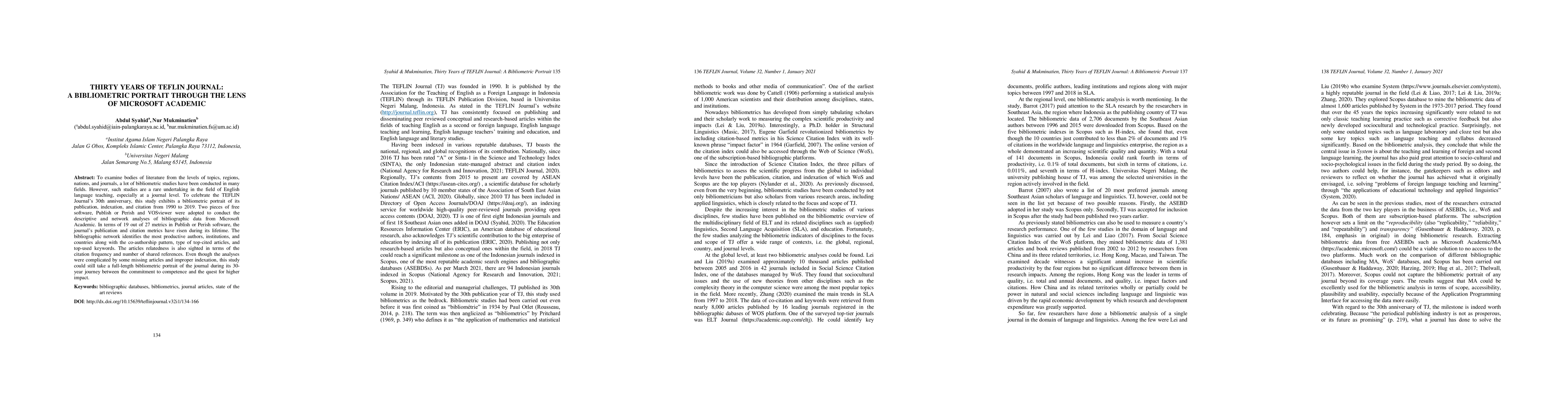 This study provides a comprehensive bibliometric analysis of TEFLIN Journal over its 30-year history from 1990 to 2019 using Microsoft Academic data. It highlights rising publication and citation metrics, identifies key authors, institutions, and countries, and examines co-authorship patterns and top-cited articles.
