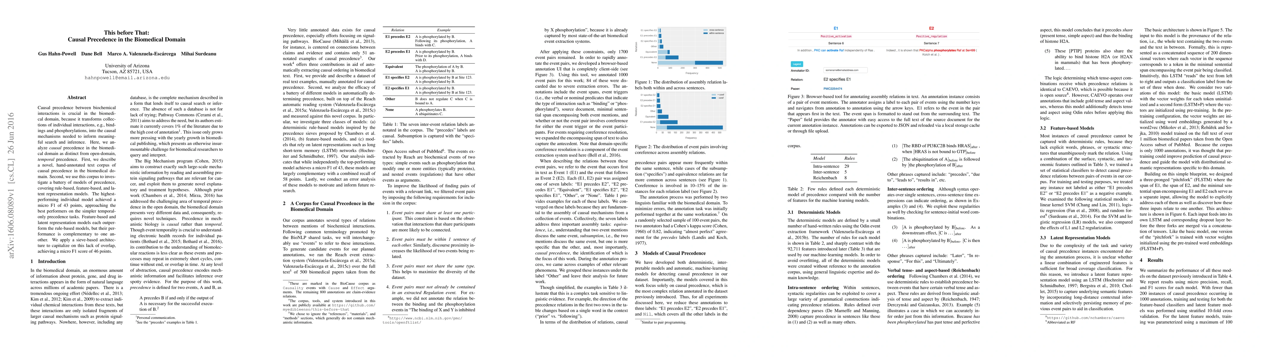 Causal precedence between biochemical interactions is crucial in the biomedical domain, because it transforms collections of individual interactions, e.g., bindings and phosphorylations, into the causal mechanisms needed to inform meaningful search and inference. Here, we analyze causal precedence in the biomedical domain as distinct from open-domain, temporal precedence. First, we describe a novel, hand-annotated text corpus of causal precedence in the biomedical domain. Second, we use this corpus to investigate a battery of models of precedence, covering rule-based, feature-based, and latent representation models. The highest-performing individual model achieved a micro F1 of 43 points, approaching the best performers on the simpler temporal-only precedence tasks. Feature-based and latent representation models each outperform the rule-based models, but their performance is complementary to one another. We apply a sieve-based architecture to capitalize on this lack of overlap, achieving a micro F1 score of 46 points.