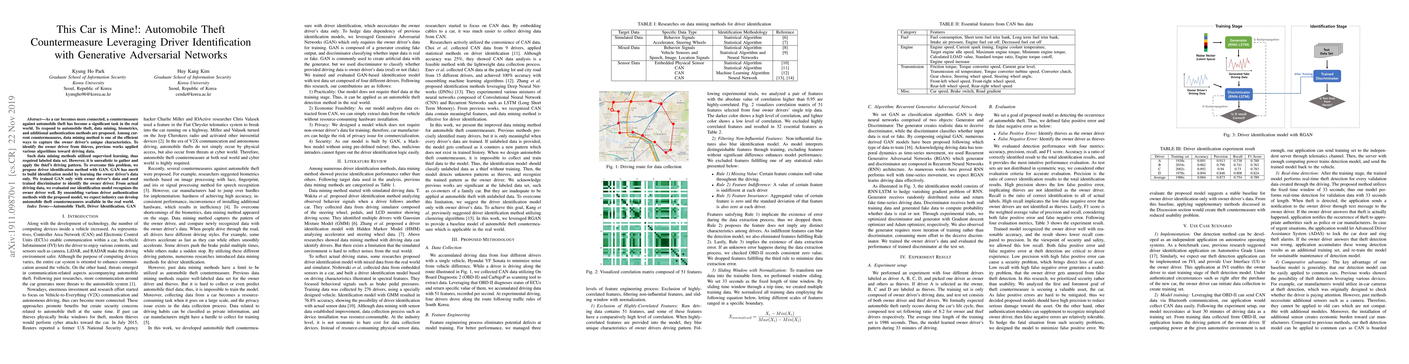This paper proposes a driver identification method using Generative Adversarial Networks (GAN) to counter automobile theft by recognizing the owner's unique driving patterns without requiring labeled data from thieves. The trained GAN model effectively identifies the owner driver, and integrating this with other authentication methods can enhance real-world automobile theft countermeasures.