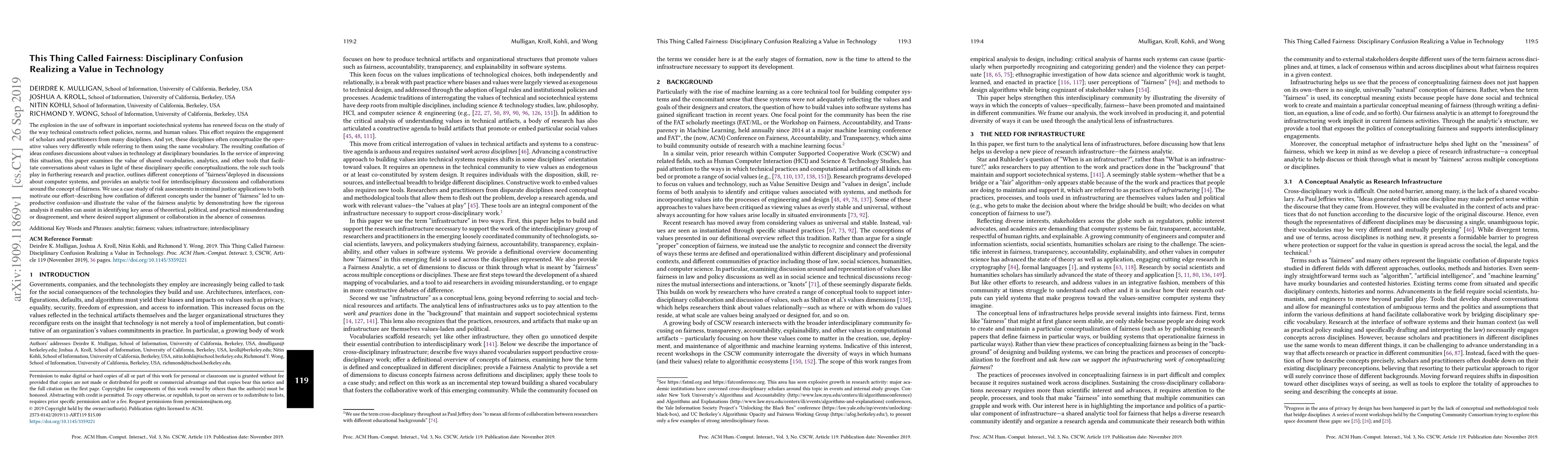 The explosion in the use of software in important sociotechnical systems has renewed focus on the study of the way technical constructs reflect policies, norms, and human values. This effort requires the engagement of scholars and practitioners from many disciplines. And yet, these disciplines often conceptualize the operative values very differently while referring to them using the same vocabulary. The resulting conflation of ideas confuses discussions about values in technology at disciplinary boundaries. In the service of improving this situation, this paper examines the value of shared vocabularies, analytics, and other tools that facilitate conversations about values in light of these disciplinary specific conceptualizations, the role such tools play in furthering research and practice, outlines different conceptions of "fairness" deployed in discussions about computer systems, and provides an analytic tool for interdisciplinary discussions and collaborations around the concept of fairness. We use a case study of risk assessments in criminal justice applications to both motivate our effort--describing how conflation of different concepts under the banner of "fairness" led to unproductive confusion--and illustrate the value of the fairness analytic by demonstrating how the rigorous analysis it enables can assist in identifying key areas of theoretical, political, and practical misunderstanding or disagreement, and where desired support alignment or collaboration in the absence of consensus.