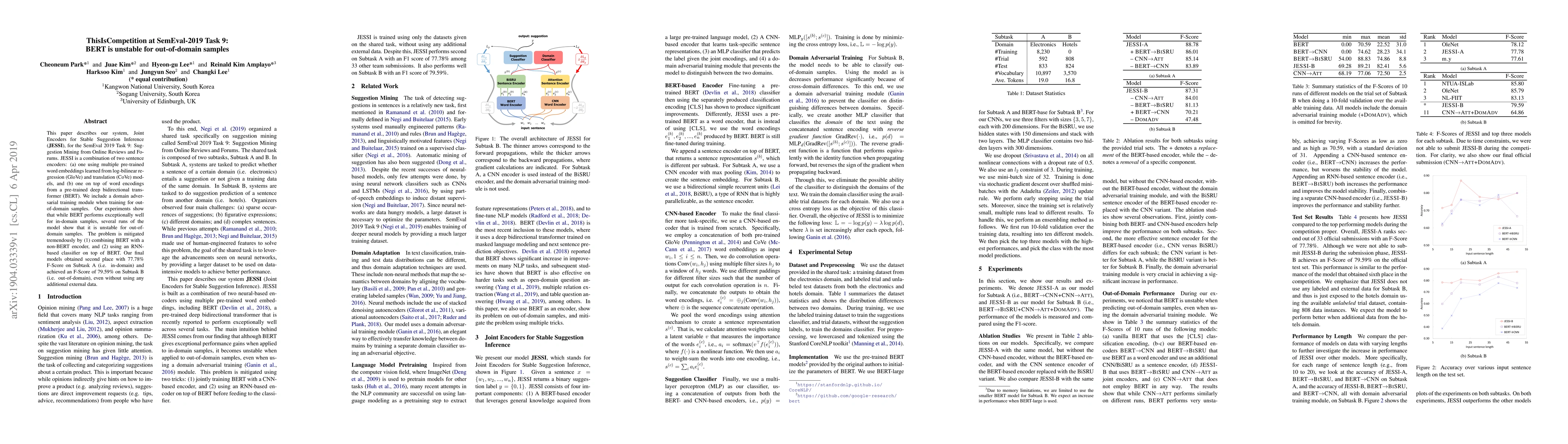 This paper describes our system, Joint Encoders for Stable Suggestion Inference (JESSI), for the SemEval 2019 Task 9: Suggestion Mining from Online Reviews and Forums. JESSI is a combination of two sentence encoders: (a) one using multiple pre-trained word embeddings learned from log-bilinear regression (GloVe) and translation (CoVe) models, and (b) one on top of word encodings from a pre-trained deep bidirectional transformer (BERT). We include a domain adversarial training module when training for out-of-domain samples. Our experiments show that while BERT performs exceptionally well for in-domain samples, several runs of the model show that it is unstable for out-of-domain samples. The problem is mitigated tremendously by (1) combining BERT with a non-BERT encoder, and (2) using an RNN-based classifier on top of BERT. Our final models obtained second place with 77.78\% F-Score on Subtask A (i.e. in-domain) and achieved an F-Score of 79.59\% on Subtask B (i.e. out-of-domain), even without using any additional external data.