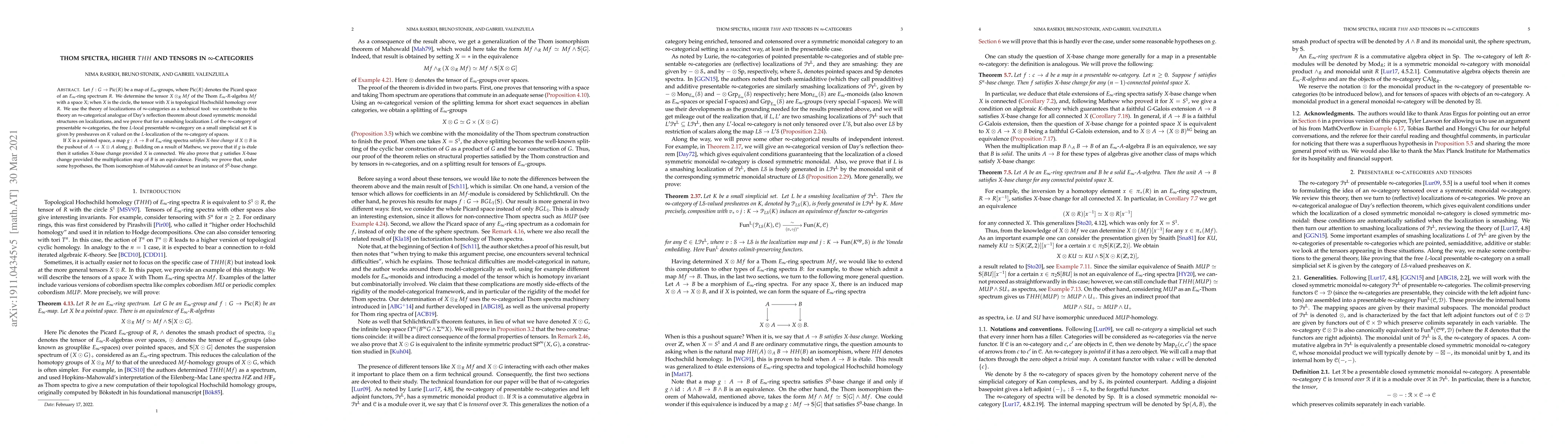 Let $f:G\to \mathrm{Pic}(R)$ be a map of $E_\infty$-groups, where $\mathrm{Pic}(R)$ denotes the Picard space of an $E_\infty$-ring spectrum $R$. We determine the tensor $X\otimes_R Mf$ of the Thom $E_\infty$-$R$-algebra $Mf$ with a space $X$; when $X$ is the circle, the tensor with $X$ is topological Hochschild homology over $R$. We use the theory of localizations of $\infty$-categories as a technical tool: we contribute to this theory an $\infty$-categorical analogue of Day's reflection theorem about closed symmetric monoidal structures on localizations, and we prove that for a smashing localization $L$ of the $\infty$-category of presentable $\infty$-categories, the free $L$-local presentable $\infty$-category on a small simplicial set $K$ is given by presheaves on $K$ valued on the $L$-localization of the $\infty$-category of spaces. If $X$ is a pointed space, a map $g: A\to B$ of $E_\infty$-ring spectra satisfies $X$-base change if $X\otimes B$ is the pushout of $A\to X\otimes A$ along $g$. Building on a result of Mathew, we prove that if $g$ is \'etale then it satisfies $X$-base change provided $X$ is connected. We also prove that $g$ satisfies $X$-base change provided the multiplication map of $B$ is an equivalence. Finally, we prove that, under some hypotheses, the Thom isomorphism of Mahowald cannot be an instance of $S^0$-base change.